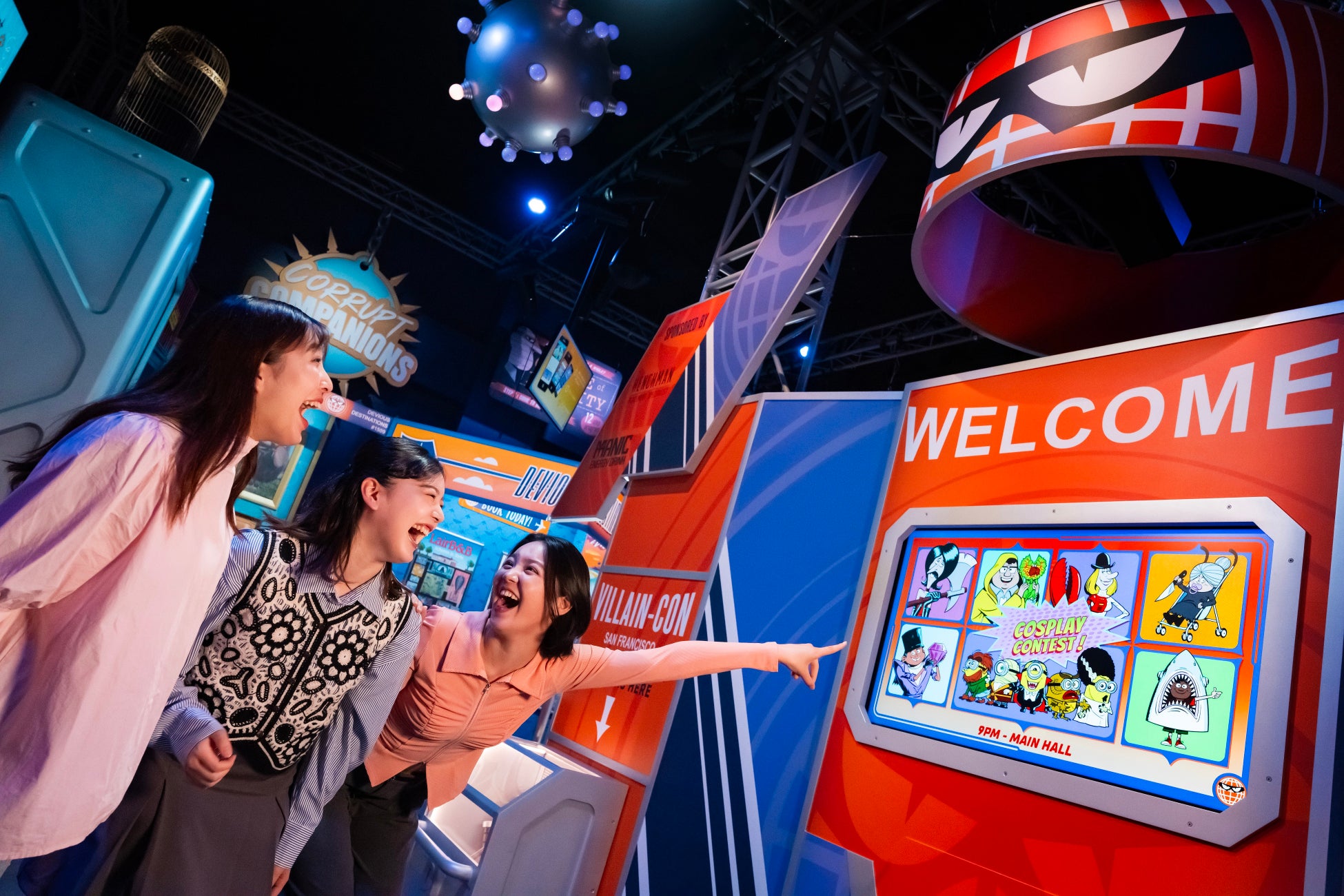 邪悪な気配ただようド派手な建物に足を踏み入れたゲストは、映画の世界そのままに極悪イベント「大悪党大会」の開催現場に遭遇、最新鋭のブラスター「イーリミネーターX」(電気銃)を手にムービング・ウォークウェイに乗りこみます。パークのアトラクション初登場のスーパー悪党グループ「ヴィシャス6」の新メンバーになるため、次々と目の前に現れる「ヴィシャス6」からの挑戦に立ち向かい、高得点を目指して、「イーリミネーターX」で撃って、壊して、シューティングの腕を競います。“やっちまえ!”と叫びたくなるほど、とことん“ワル”になり切って遠慮不要に何もかもぶっ飛ばす爽快シューティング体験に、子どもから大人まで誰もが満面の笑顔で楽しみました。