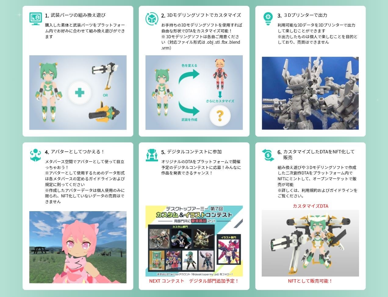 従来のDTAファンだけでなく、デジタルクリエイティビティを楽しみたい方やWeb3.0に興味のある方、自身による二次創作作品を販売して収益を得たい方、コンテンツの創出に参画したい方に向けたサービスです。