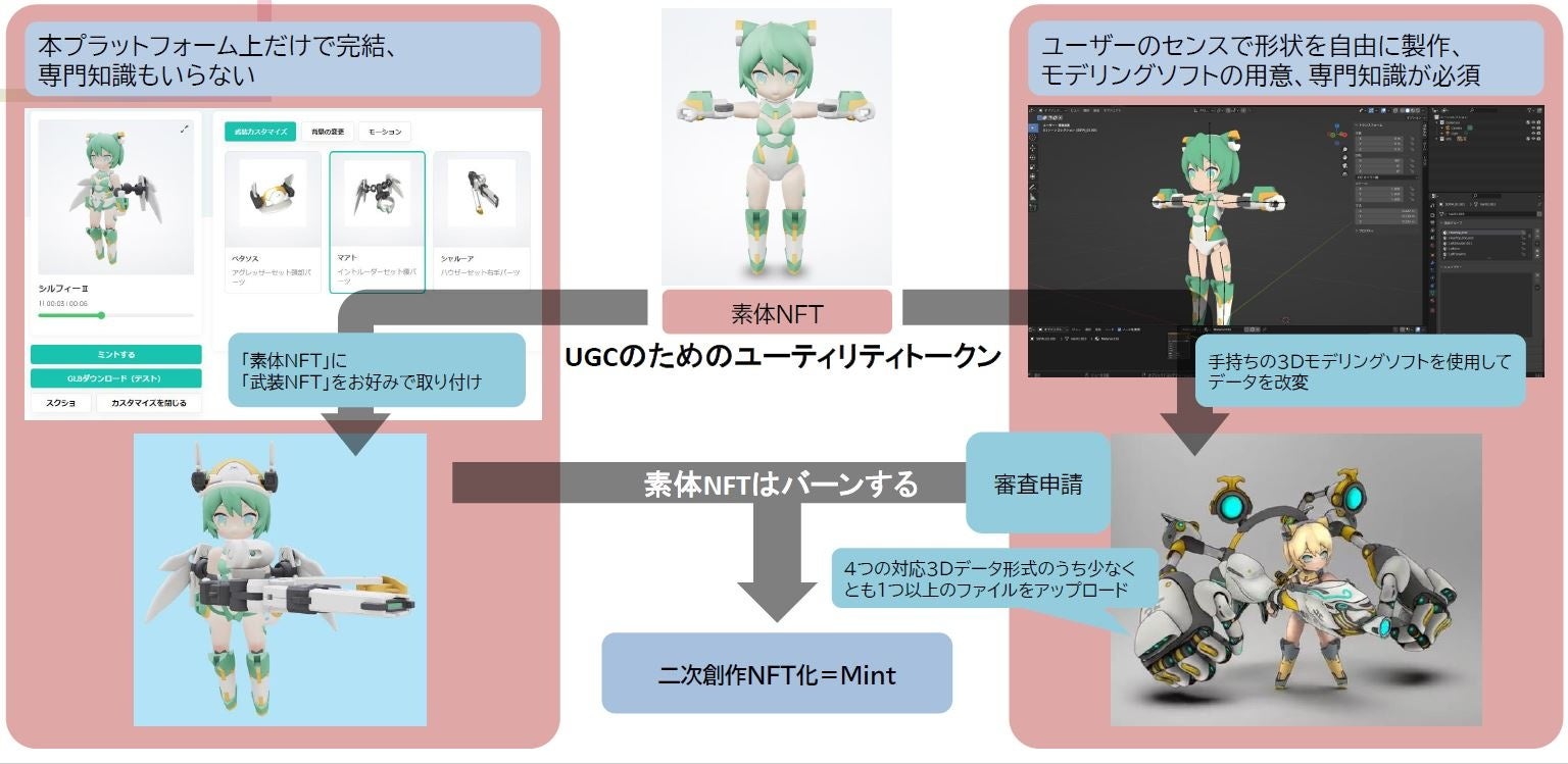 ユーザーは自身のスキルや環境に合わせて、二種類の改変方法を選択することができます。ビギナー向けには、プラットフォーム内で素体NFTと武装NFTを組み合わせて遊ぶことができます。一方、3Dモデリングに詳しいユーザーは、NFTに付与された3Dデータをダウンロードし、独自の改変を楽しむことができます。