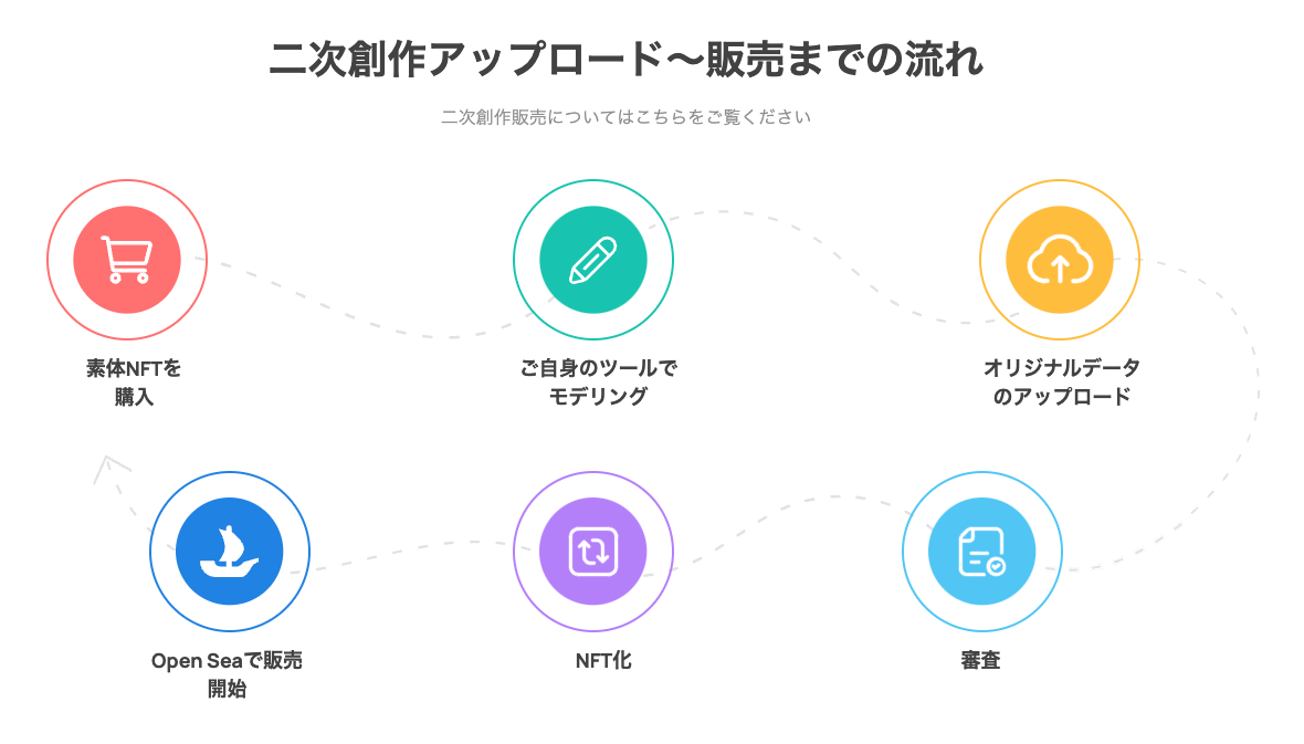 Web3.0ならではのトークンエコノミーも導入し、持続的なUGCを促進します。二次創作したデータはDTA NFTプラットフォームを通じて承認されることで再NFT化され、オープンマーケットでの個人間売買が自由に行えるため、その収益を得ることが可能です。さらに、売買が繰り返された場合、売買益の一部もロイヤリティとして受け取ることができます。(※オープンマーケットでのブロックチェーンはpolygonを使用)