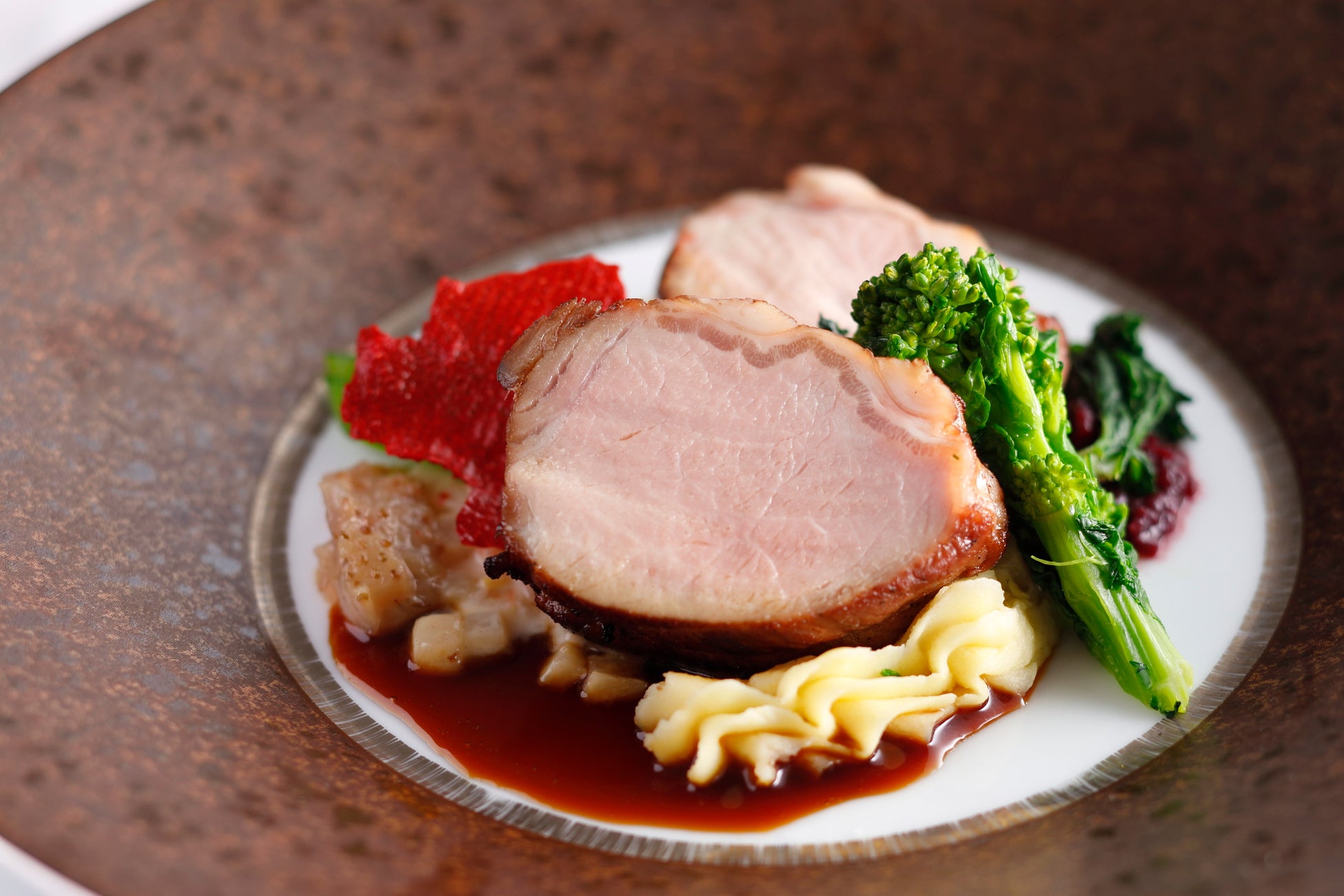 “金星佐賀豚”ロース肉は、柔らかさと香ばしさが楽しめるよう、梅酒でキャラメリゼしました。二色の苺のソース、ビーツのチュイルの甘酸っぱい風味が“金星佐賀豚”の旨味を引き立てます。