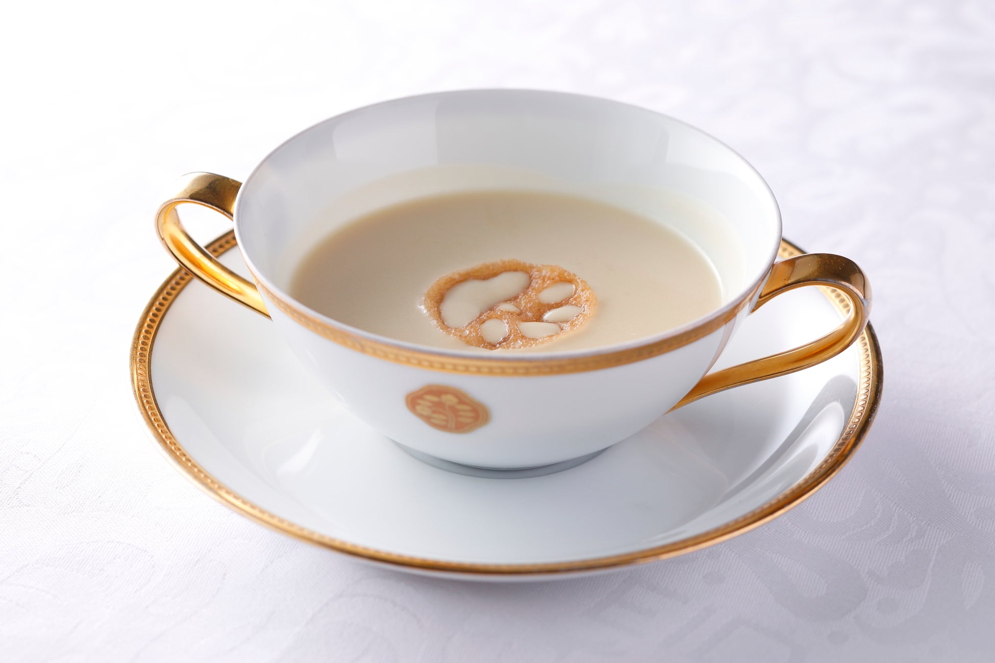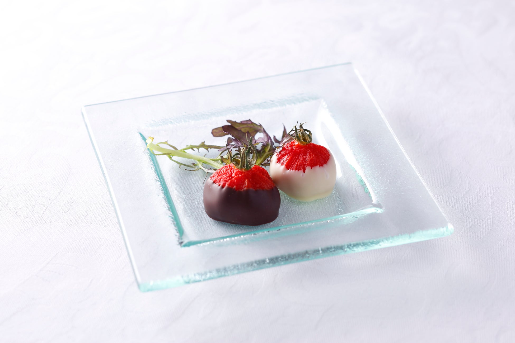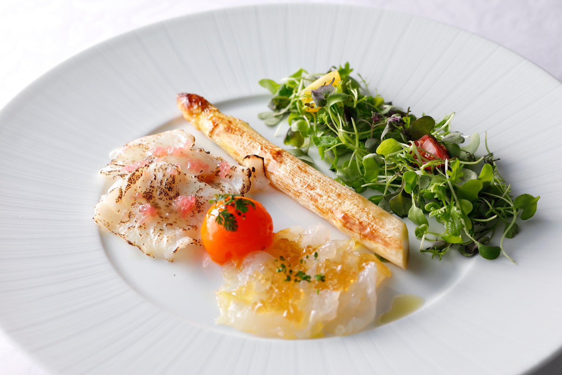 セミドライのプチトマトにチョコレートを合わせたアミューズや、旬のアスパラガスを卵黄、柑橘の香りと一緒に楽しむ前菜をご用意しました。れんこんのポタージュには、日本有数の産地として知られる佐賀県白石町の“黒木農園”で採れたれんこんを使用しています。