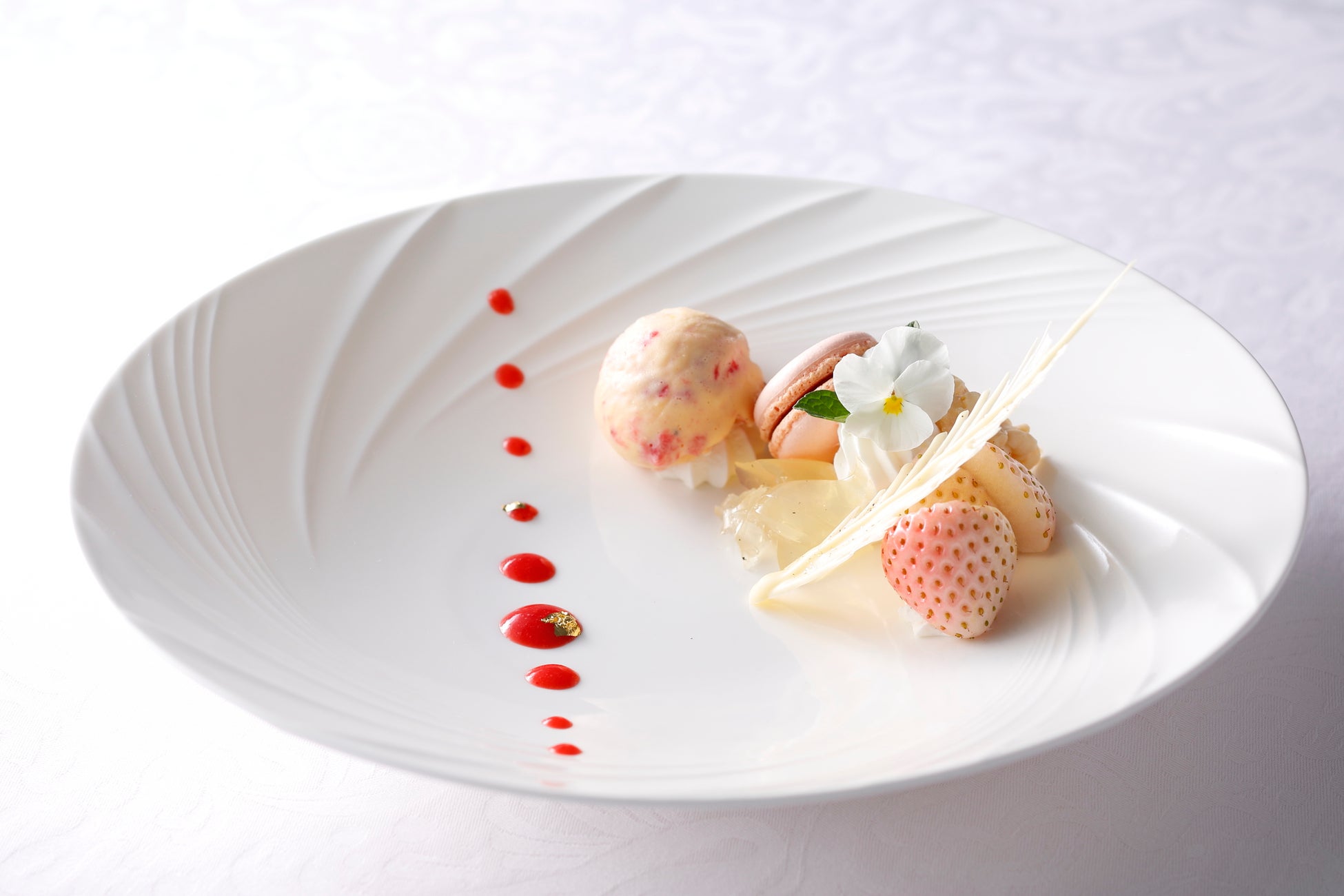 デザートには、見た目にも可愛らしい淡い桃色の苺“天のしずく”とアイスクリームをデコレーションしたひと皿をご用意しました。コース料理の最後まで、佐賀県産の食材の美味しさをお楽しみください。