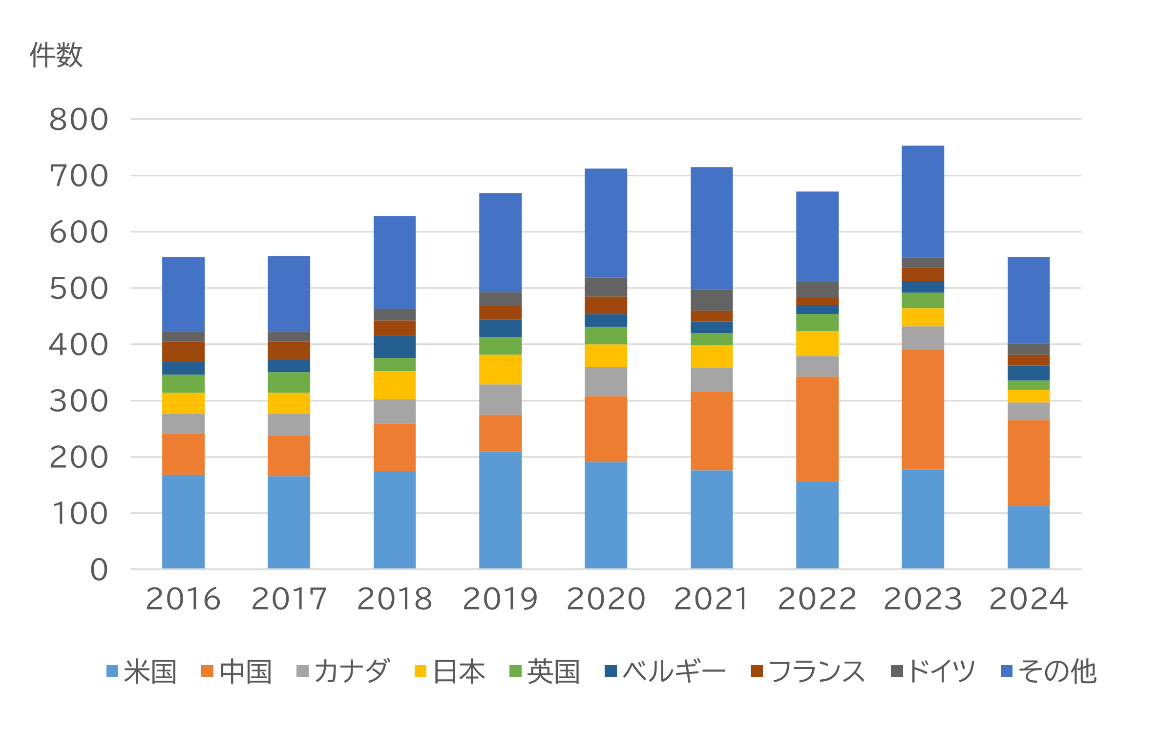 グラントとおなじ米日英の3か国にくわえ、グラントでは除外していた中国、そして新たにカナダ、ベルギー、フランス、ドイツが入っています。中国は2019年以降継続的に件数を伸ばしており、研究体制の拡大が進んでいることがうかがえます。