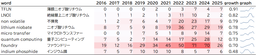 最後のインジウム燐は上昇キーワードではありませんが、ニオブ酸リチウムにつぐ光変調器材料として注目が高かった時期があったため、比較対象として掲載しています。出現頻度の年次推移で比べると、2020年まではインジウム燐がニオブ酸リチウムを件数で上回っていましたが、2021年からはニオブ酸リチウムの件数が急激に上昇し、インジウム燐は減少しました。この時期に光変調器材料の研究対象としての主役がインジウム燐からニオブ酸リチウムに移行したといえます。ほかの光変調器材料としてはチタン酸バリウム(BTO)がgrowth値0.59で中程度の上昇となっています。