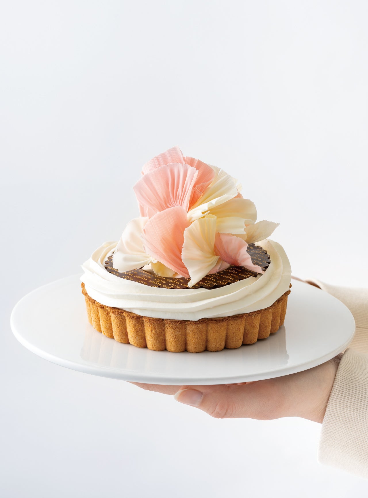 花束をイメージしたデコレーションが華やかなタルトです。爽やかなレモン風味のホワイトチョコレートガナッシュと、フルーティなピンクグレープフルーツのジュレを、サクサクとした食感のタルト生地で包み込みました。ほんのりとした甘さとほろ苦さが絶妙なバランスをお楽しみいただけます。