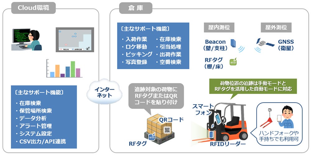 「SHO-XYZ」は、モノに貼り付けられたRFタグをRFIDリーダーと接続したスマートフォンから読み取ることで、屋内外にあるモノの保管位置を自動追跡することができるSaaS型のクラウドシステムです。また、WMS(注1)などの一般的な倉庫管理システムで必要な入出荷などの管理機能も備わっているため、QRコードやバーコードを活用することでモノのロケーションから在庫管理まで行うことが可能です。そのほか外国人労働者への多言語対応や現場で使われている特有の文言などにも対応しています。
