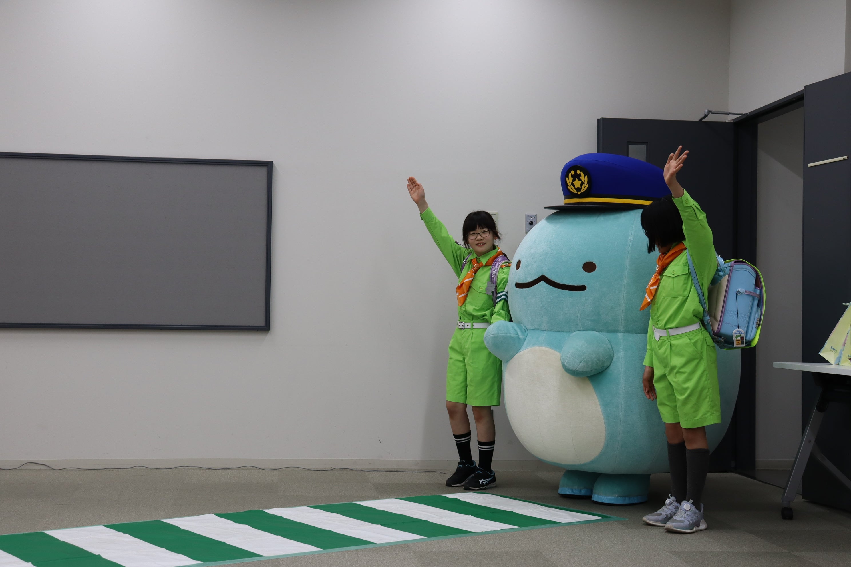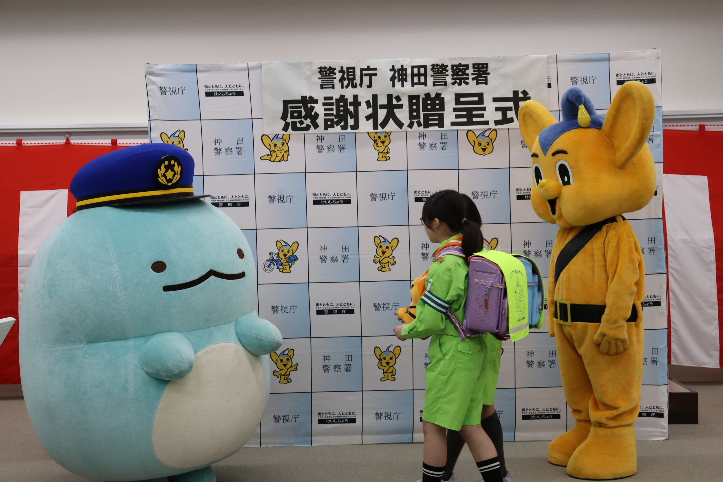 贈呈式には、神田警察署長、神田交通安全協会会長、警視庁シンボルマスコットのピーポくん、「すみっコぐらし」ランドセルカバーを装着したランドセルを背負う小学生2名に加え、すみっコぐらしのキャラクター「とかげ」も登場しました。
