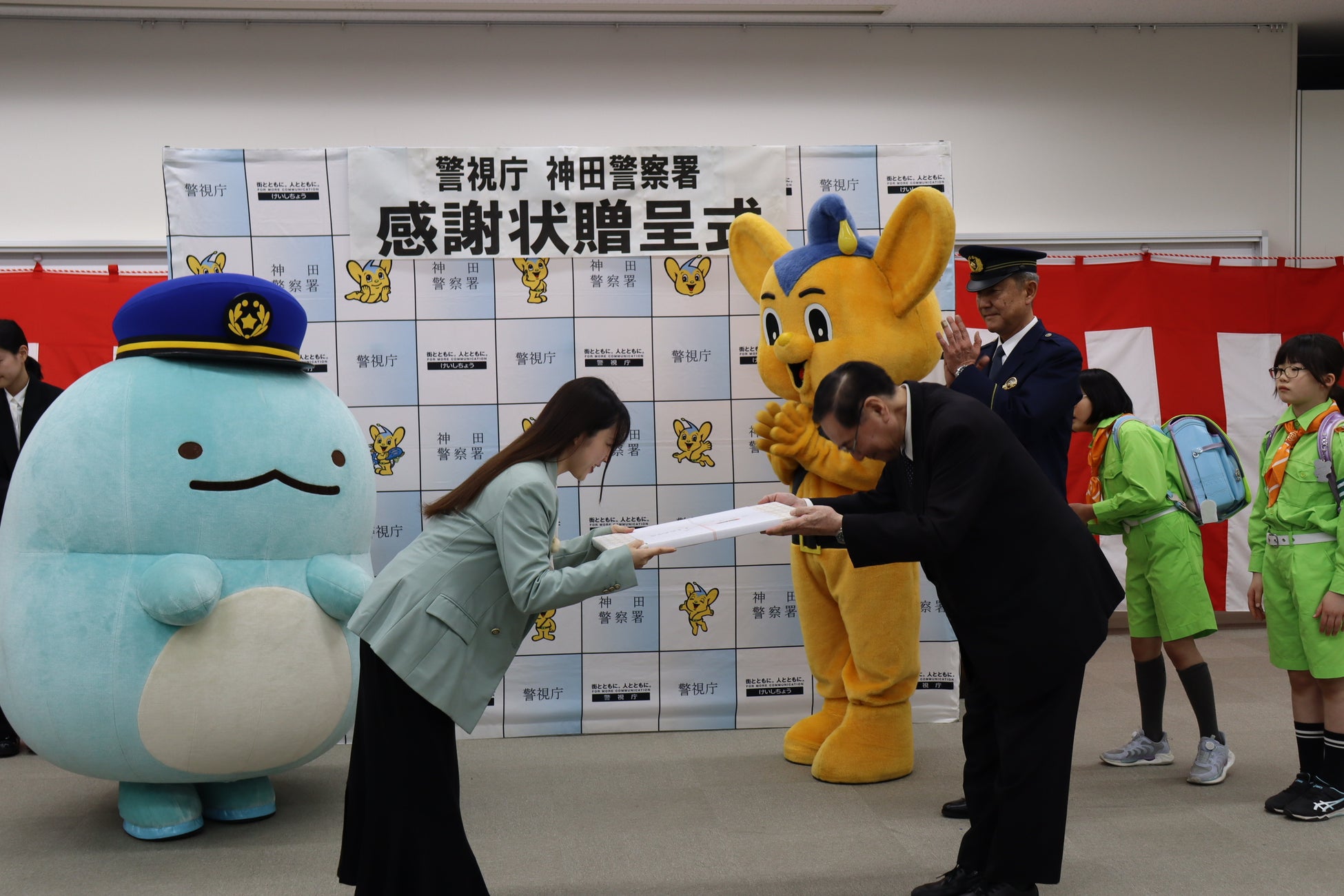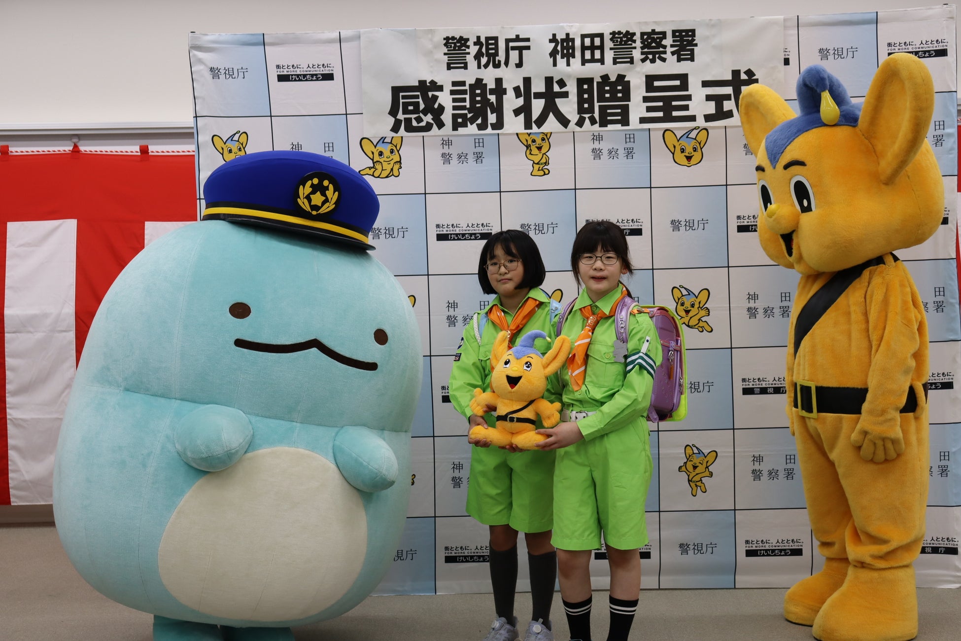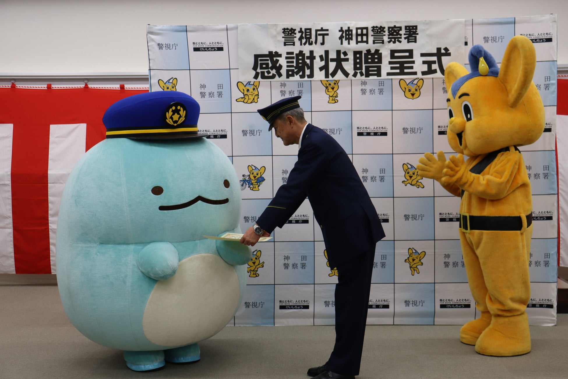 ●すみっコぐらし「とかげ」、ピーポくんが見守る中、神田警察署長より感謝状を受領
