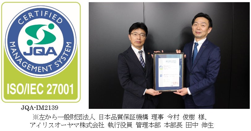 アイリスオーヤマ株式会社(本社:宮城県仙台市、代表取締役社長:大山 晃弘)は、アイリスグループの国内拠点「東京R&Dセンター」(東京都大田区)、「東京アンテナオフィス」(東京都港区)、「アイリス 卸町ビル」(宮城県仙台市)において、情報セキュリティマネジメントシステムに関する国際規格である「ISO/IEC 27001:2022」の認証を2024年12月20日(金)に取得し、本日、東京アンテナオフィスで登録証の授与式を実施しました。