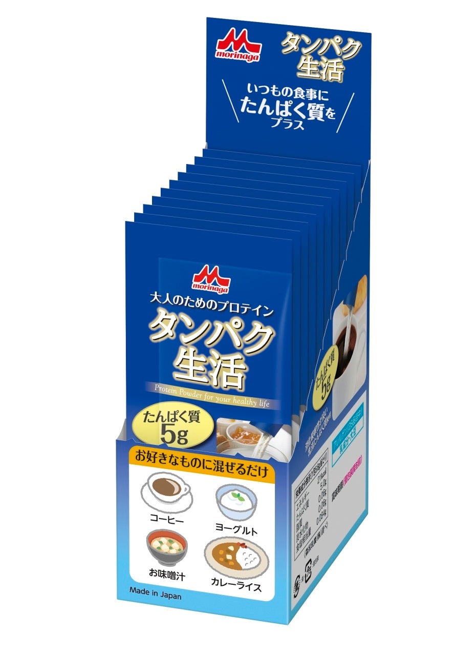 このような背景もあり、大人世代の方に健康でイキイキとした生活を送っていただきたいと、いつでも、どこでも、お好 みの飲み物や料理に使用できる、ほとんど無味無臭のプロテイン粉末「タンパク生活」を新発売します。日常生活の中 で無理なく手軽にたんぱく質を摂取いただけますので、ぜひこの機会にお試しください。