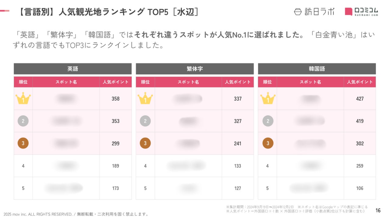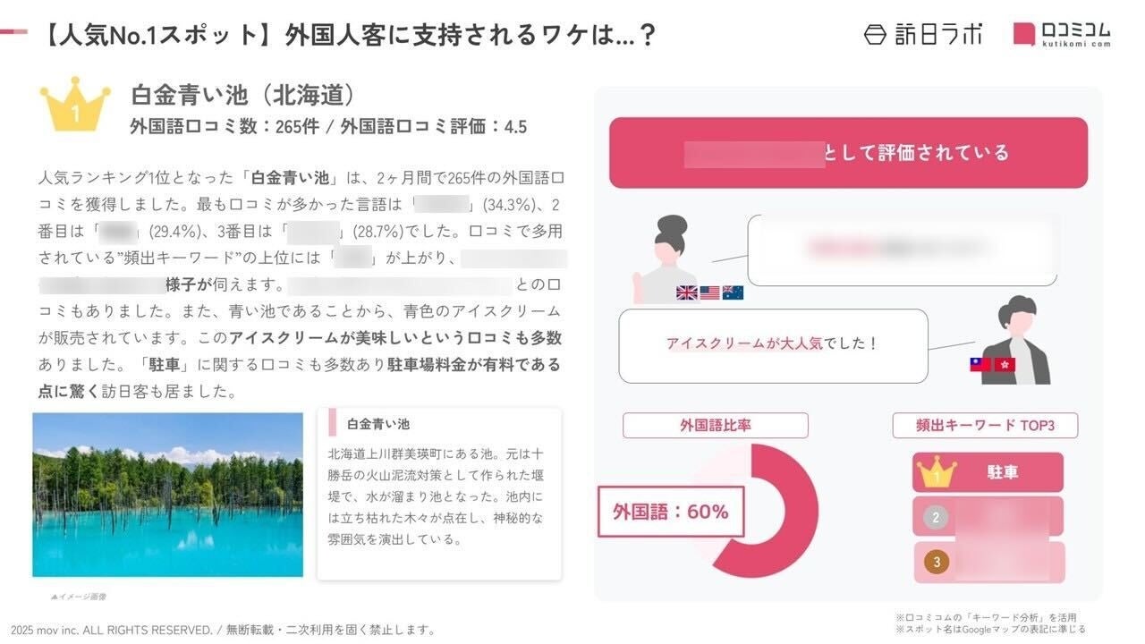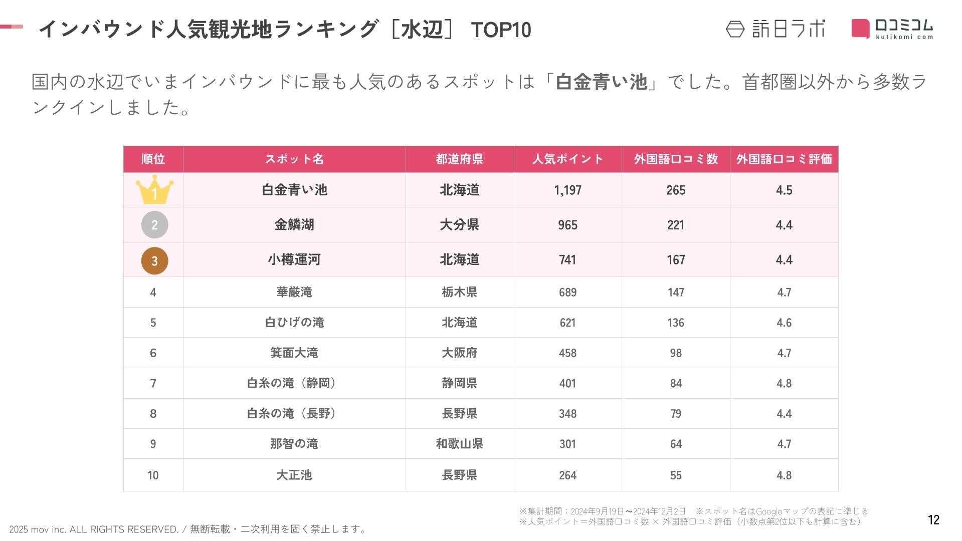 業界最大級のインバウンドビジネスメディア「訪日ラボ」及び 店舗向け集客一元化プラットフォーム「口コミコム」を運営する株式会社mov(代表取締役:渡邊 誠、本社:東京都渋谷区、以下mov)は、国内の水辺(川・滝・湖・池)に寄せられた最新の口コミデータから、独自の『インバウンド人気観光地ランキング』を発表しました。