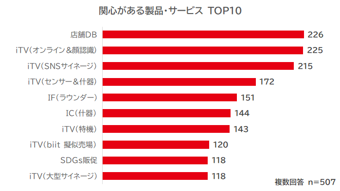 最も関心を集めた製品・サービスは、現在当社グループでも注力している 「店舗DB」 で、 「自社のPOSデータと掛け合わせて分析したい」 という声が多く上がりました。次いで、impactTVの 「オンライン&顔認識サイネージ」 で、 「曜日や時間帯により訴求するコンテンツを頻度高く更新したい」 という声もありました。また、SNSと連動させたimpactTVの 「SNSサイネージ」 やセンサー技術を用いた 「センサー&什器」 、インパクトフィールドの 「ラウンダー」 、impact connectの 「リノベーション什器」 なども関心を集めました。