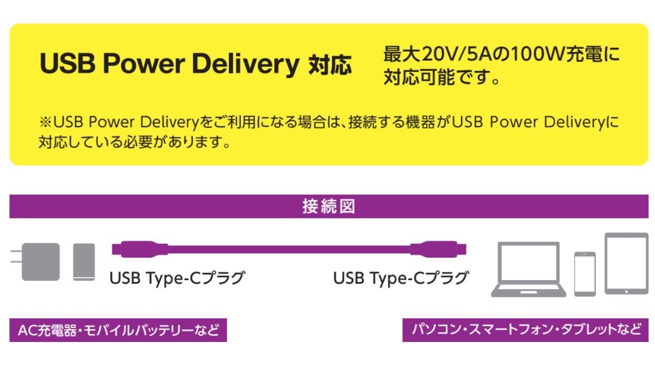 ■USB Power Deliveryに対応しており、最大100W(20V/5A)で接続機器への給電が可能です。