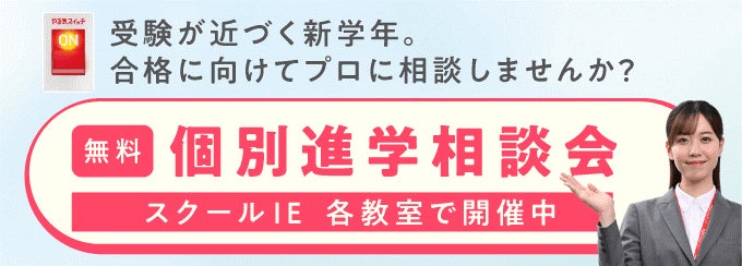 ●全国1,200教室以上の「スクールIE」で教育のプロである教室長による一人ひとりに合わせたアドバイス ●お子さまの夢や目標を踏まえ、お子さまにぴったりの志望校、入試制度、勉強方法をお伝え ●2025年4月30日(水)までの入会で入会金無料キャンペーンも実施中 |