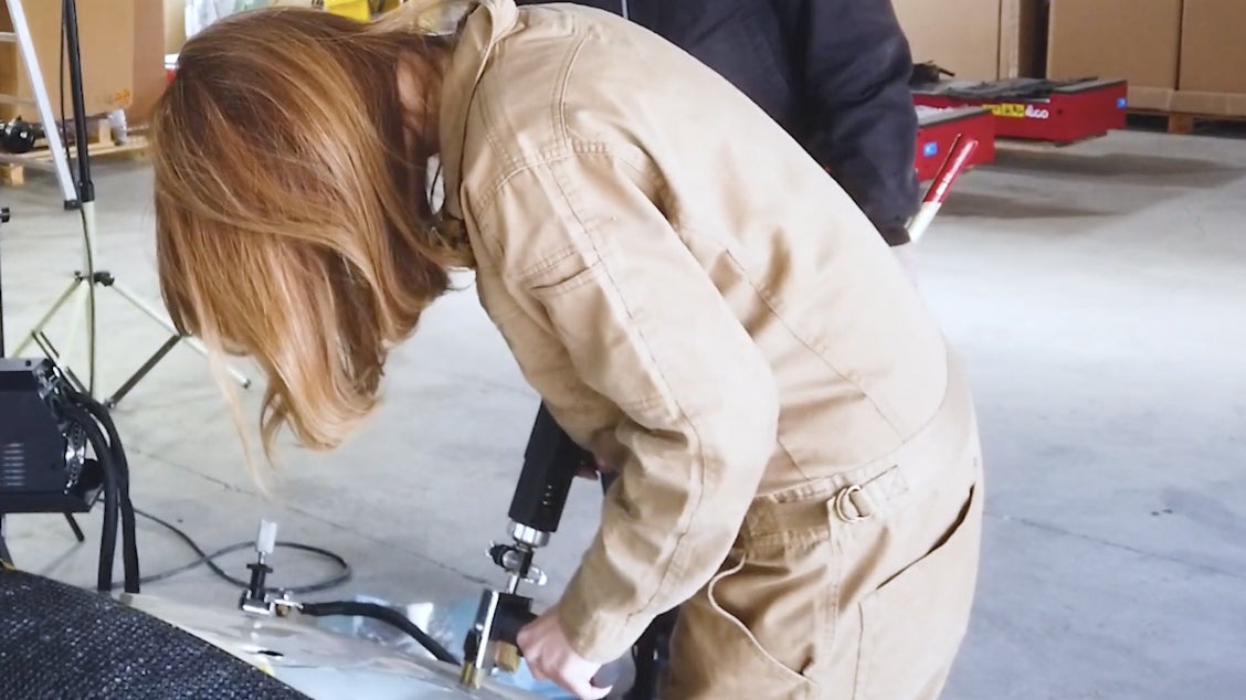 車体のへこみを修復する小型スタッド溶接機「ウルトラスポットNANO」。