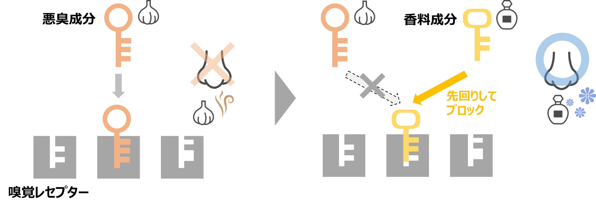 悪臭を抑制するもう一つのアプローチとして、鼻にある臭いを感じる器官である嗅覚レセプターの特性を応用した「レセプターロック技術」があります。ヒトには約400種の嗅覚レセプターがあるといわれており、におい成分がレセプターと結合することでそのにおいを認識する、鍵(におい成分)と鍵穴(レセプター)のような仕組みをとっていることが知られています。「レセプターロック技術」は、悪臭とは別のにおい成分がレセプターに結合することで、悪臭成分がレセプターと結合できないようにして、悪臭を感じにくくさせる手法です(図3)。ジアリルジスルフィドと同様のレセプターに結合する天然香料としてオポポナックス油が知られており、このオポポナックス油とベルガモット油、ベチバー油を含んだ香料を使用することで、「ハーモナージュ効果」のみよりも高い悪臭抑制効果を実現できることが明らかとなりました(図1)。