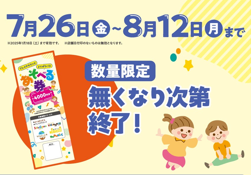 株式会社イオンファンタジー(本社:千葉県千葉市、代表取締役社長:藤原徳也、以下、当社)は、7月26日(金)から8月12日(月)までの期間、当社が運営するモーリーファンタジー等のアミューズメント施設やプレイグラウンドにて、対象のゲーム機が時間内遊び放題になる定額サービス「よくばりパス」や「スキッズガーデン」「キッズーナ」「わいわいぱーく」等のプレイグラウンドが1万円(税込)で1万2千円分あそべるおトクなチケットセット「あそべる券」を販売します。