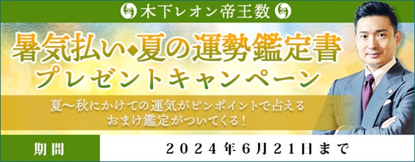 毎週火曜日夜8時より絶賛放送中の占い番組『突然ですが占ってもいいですか?』(フジテレビ系列)で人気を博している木下レオン。ただいま、月額公式サイトで『暑気払い◆夏の運勢鑑定書プレゼントキャンペーン』を開催中です。期間中、対象の占いメニュー購入で、この夏~秋にかけての運勢が分かる特別なおまけ鑑定がついてくるお得なキャンペーンとなっております。ぜひこの機会にお試しください。