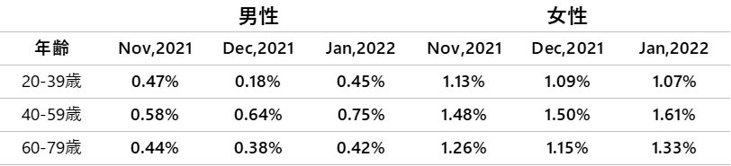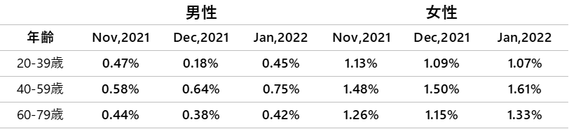 - ●上昇率が最も大きいのは40~59歳・男性で1.61%、最も小さいのは60~79歳・女性で0.42%