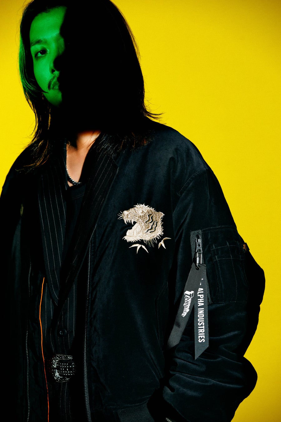 Alpha IndustriesのヘリテージであるMA-1を別珍素材にアレンジしたモデルや、 ウェア全体に加工が施されたスカジャンは、テンパレイ小原氏ならではのアレンジで「酔狂」= “Suykyo"の刺しゅうをオン!