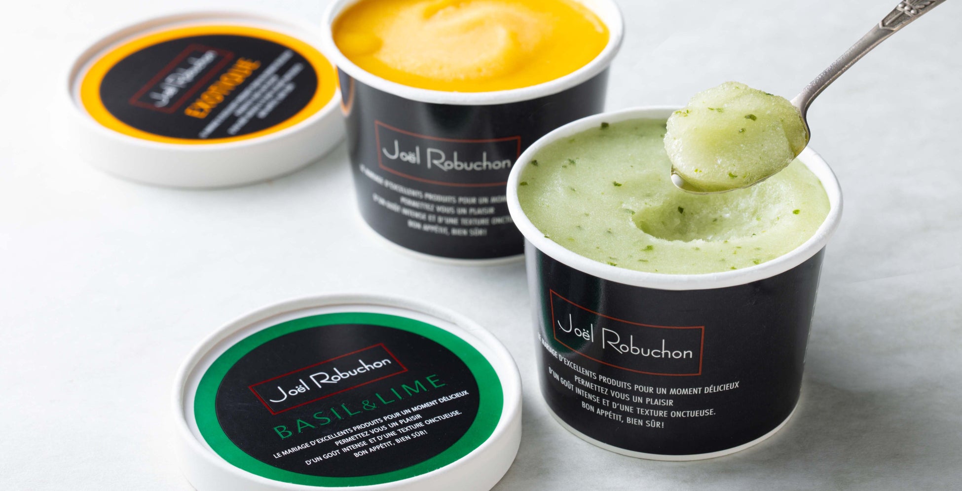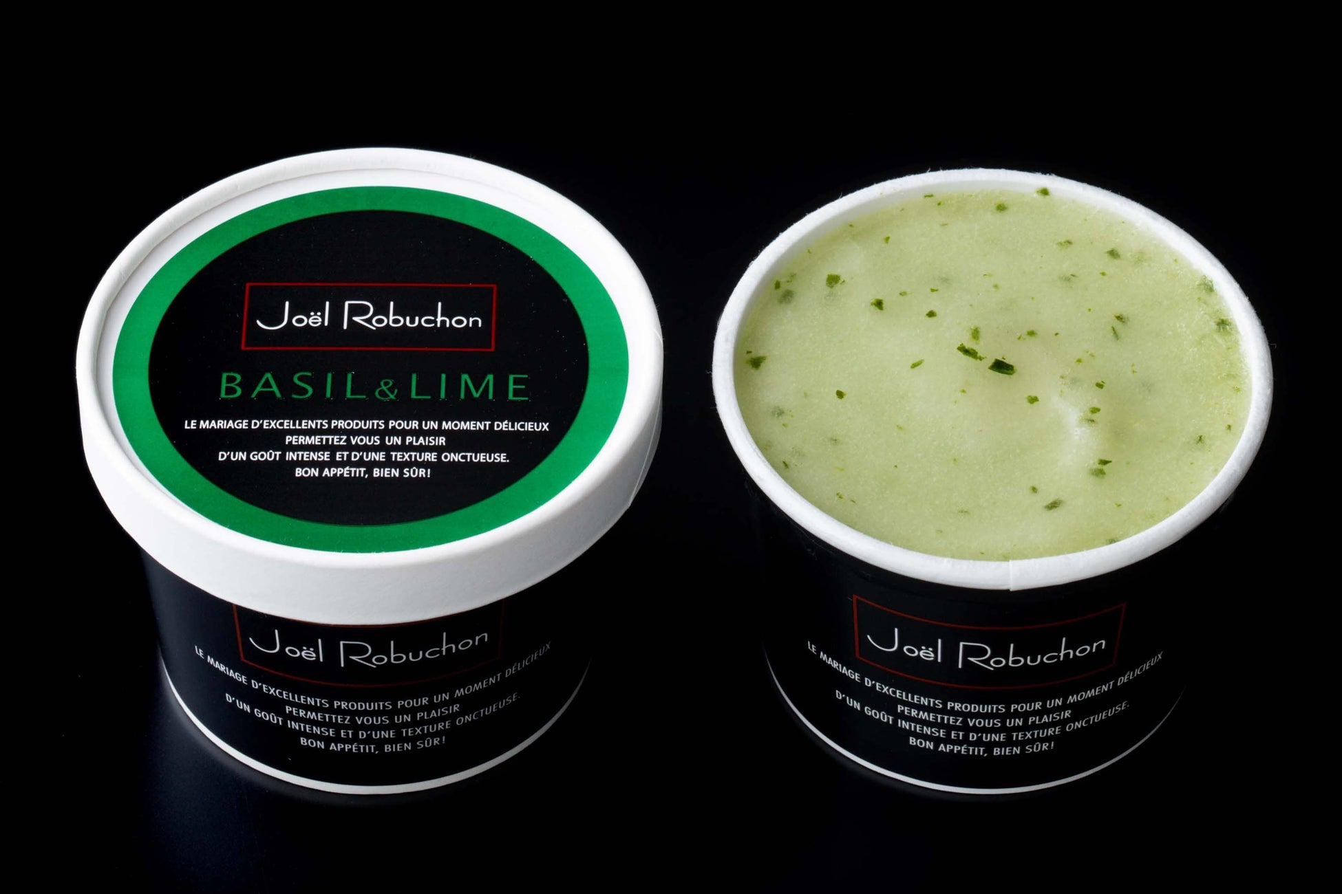『ジョエル・ロブションのアイス&ソルベ』はフレンチレストラン「ラトリエ ドゥ ジョエル・ロブション」(東京・六本木)開業以来、20年以上にもわたり人気の「バジル&ライムのソルベ」をご家庭でもお楽しみいただきたいとの想いから誕生しました。