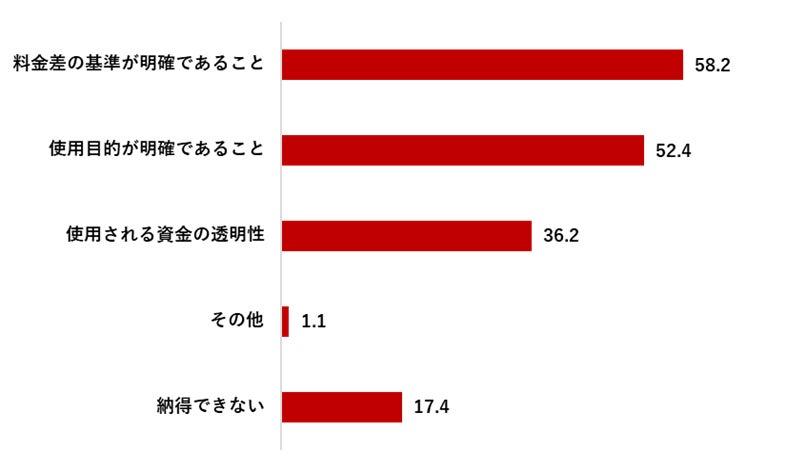 どのような情報があれば国内の二重価格に納得できるかを聴取した。「料金差の基準が明確であること」が58.2%でトップ、次いで「使用目的が明確であること」(52.4%)、「使用される資金の透明性」(36.2%)が続いた。