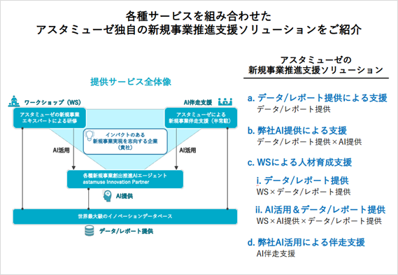 アスタミューゼ株式会社(本社:東京都千代田区、代表取締役社長:永井歩)は、データとAIを中核に据えた「新規事業開発・推進支援ソリューション」の提供を大幅に強化し、本格稼働しました。