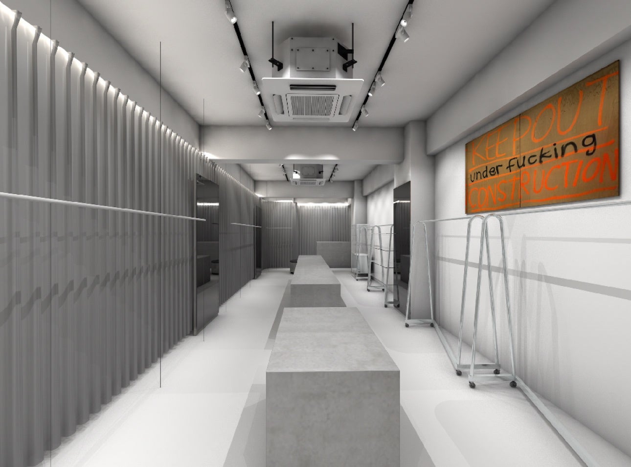 内装は魅力的なブランドのプロダクトたちが映えるよう、白を基調に壁沿いに走るカーテンやキューブ型什器でミニマリスティックデザインを実現しました。