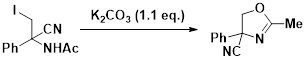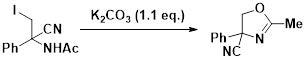 今回の反応でエナミド基質をヨードシアノ化した生成物からは、下の反応式に見られるように、機能性材料や医農薬などの生物活性物質に見いだされるオキサゾリン化合物を容易に合成できます。ヨードシアノ化の反応条件も極めて温和ですので、天然物や生物活性物質の合成に適用することが期待されます。