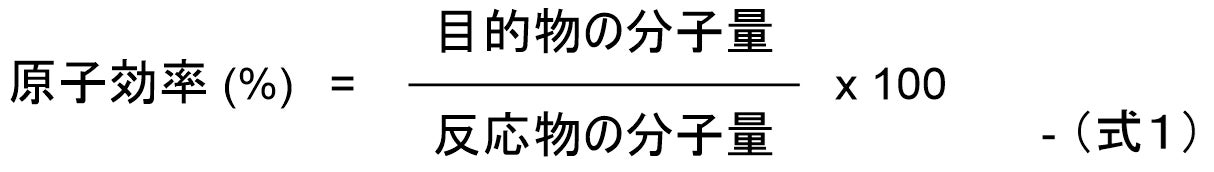 注2)原子効率(アトムエコノミー):原料に試薬などを作用させて生成物を得る反応を行う際、生成物以外に不要な物質が生じることがある。ムダにならずに使われる原子の割合を反応式(1)で示し、化学変換プロセスの効率を表す指標。