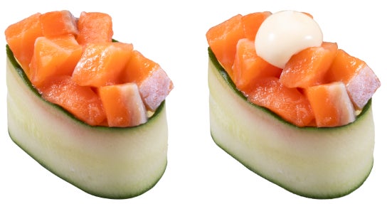 きゅうりを薄くスライスして、シャリに巻いた『新発想!かっぱ軍艦』をご提供いたします。軍艦といえば「海苔」ですが、きゅうりの爽やかな風味がネタの味わいを引き立てる、新たなおいしさです。