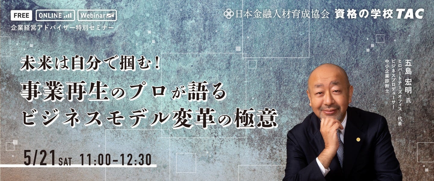 公認会計士や税理士など、多くの国家資格や検定試験の受験指導などの教育事業を展開しているTAC株式会社(東京都千代田区、代表取締役:多田敏男)は、経営知識が学べる企業経営アドバイザー講座から、無料セミナー「未来は自分で掴む!事業再生のプロが語るビジネスモデル変革の極意」を2022年5月21日(土)に開催します。