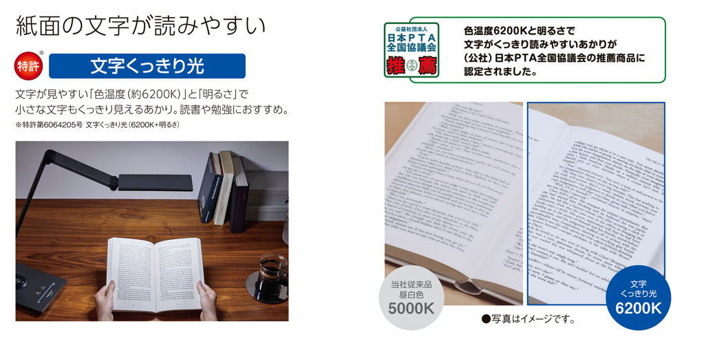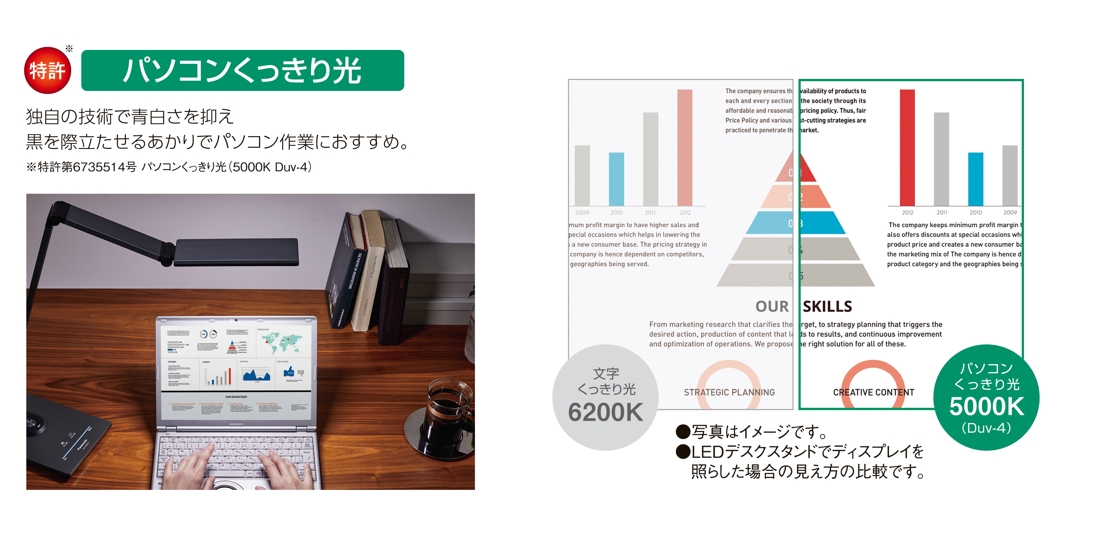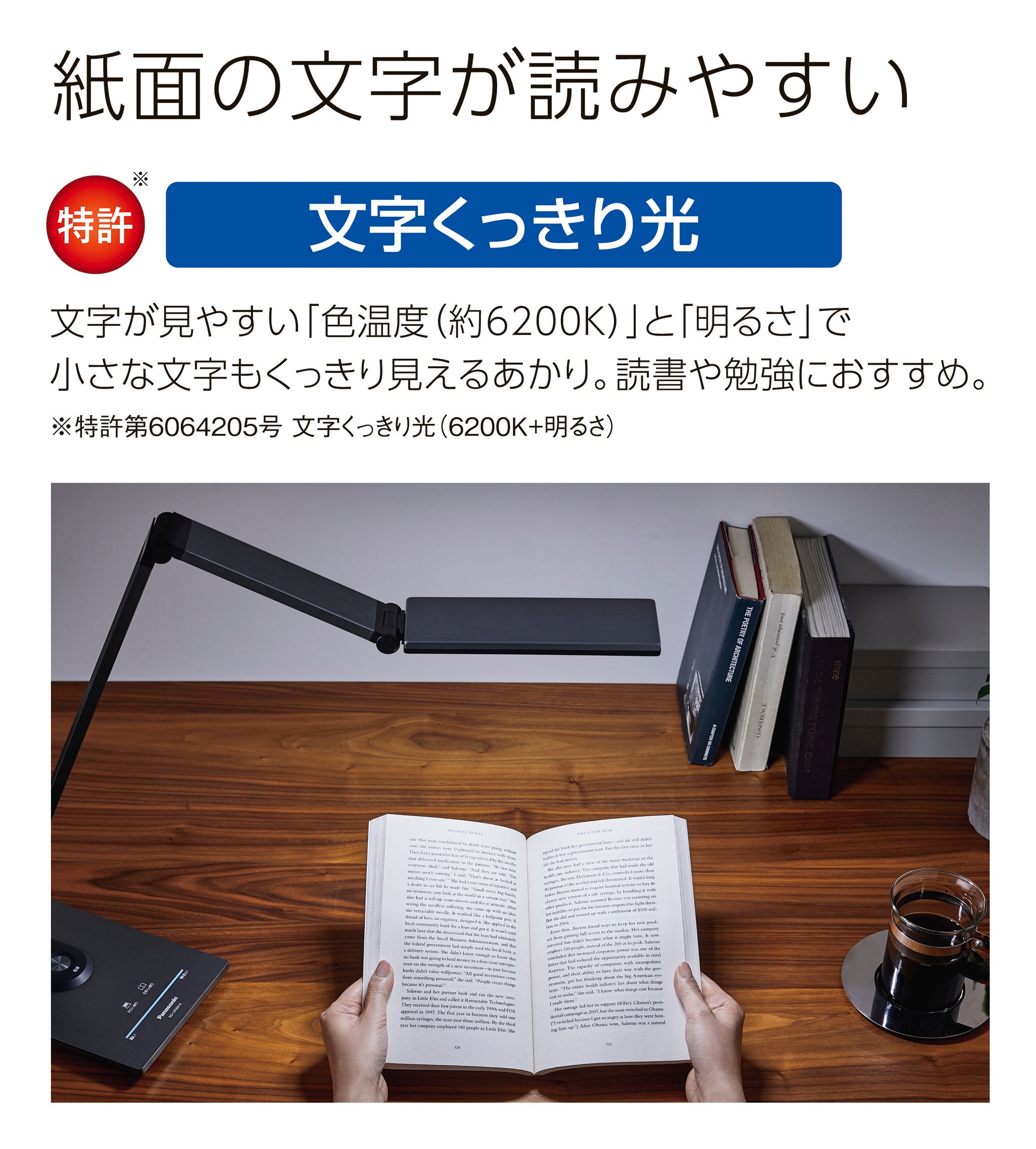 パルックLEDデスクスタンド「SQ-LD560」「SQ-LC570」「SQ-LC470」は、“パソコンくっきり光”を搭載しています。紙面とは違い、それ自体が発光しているパソコンの画面では、白が青白く、黒は淡い黒に見えてしまいます。”パソコンくっきり光”は青白さを抑え、黒を引き立たせる波長制御でパソコンの画面が見やすいあかりを実現しました。スマートフォンやタブレットにも対応しています。また、紙面の文字も読みやすい”文字くっきり光”も搭載しており、在宅ワークでのパソコン作業、勉強や読書など用途に応じて切り替えが可能です。