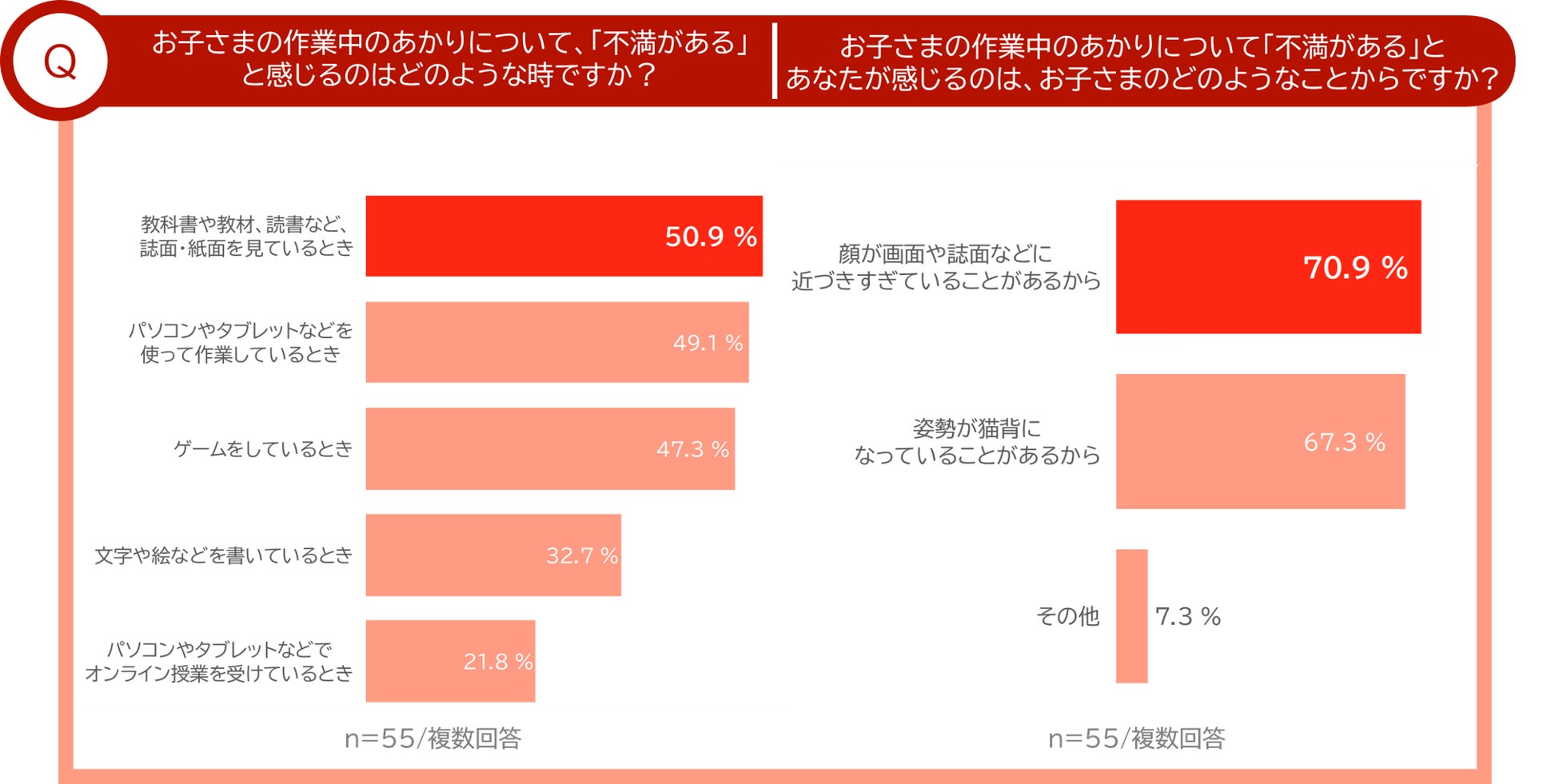 また、子どもの作業中のあかりに不満があると感じるのはどのようなところからかと聞いたところ、「顔が画面や誌面などに近づきすぎていることがあるから」(70.9%)「姿勢が猫背になっていることがあるから」(67.3%)との回答でした。自宅で教科書やタブレットを用いて勉強をしている際、見えづらさから子どもの姿勢が悪くなっていると感じる保護者が多いことがわかりました。