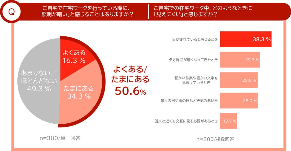 在宅ワークを行なっている方を対象に、「自宅の照明が暗いと感じることがあるか」と聞いたところ、50.6%と約半数の方が「よくある」「たまにある」と回答しました。見えにくいと感じるタイミングについては「目が疲れていると感じるとき」(38.3%)、「夕方周囲が暗くなってきたとき」(29.7%)、「曇りや雨の日など天気の悪い日」(28%)などの回答が上位となりました。在宅ワークの中で、長時間の作業や暗くなってくる夕方以降の時間において、細かい作業やパソコン・タブレットを操作していることが、見えにくいと感じる要因となっていることがわかります。