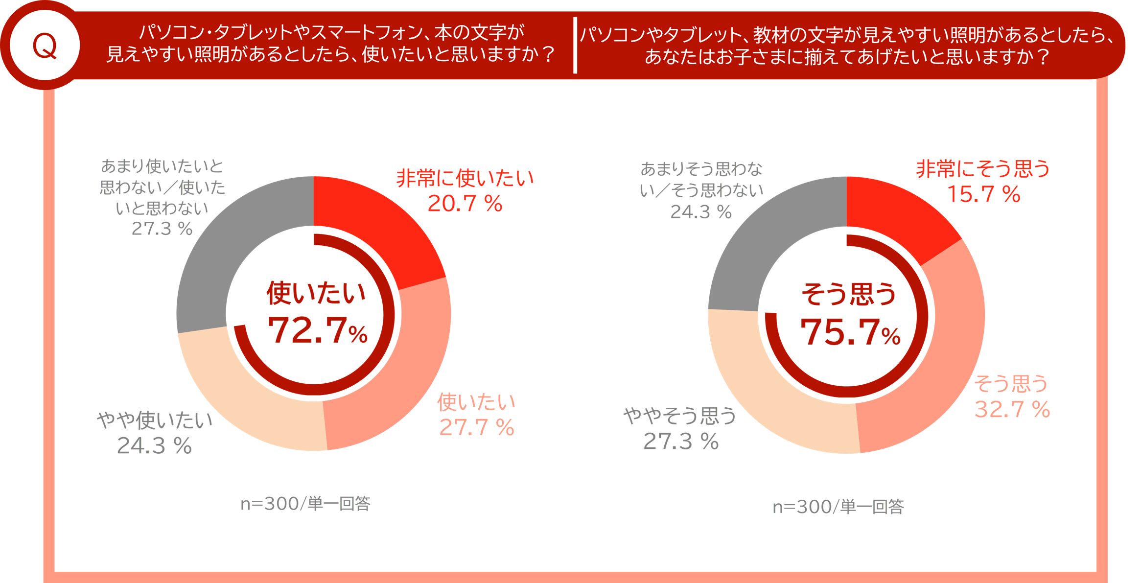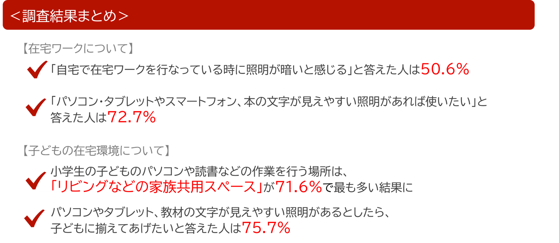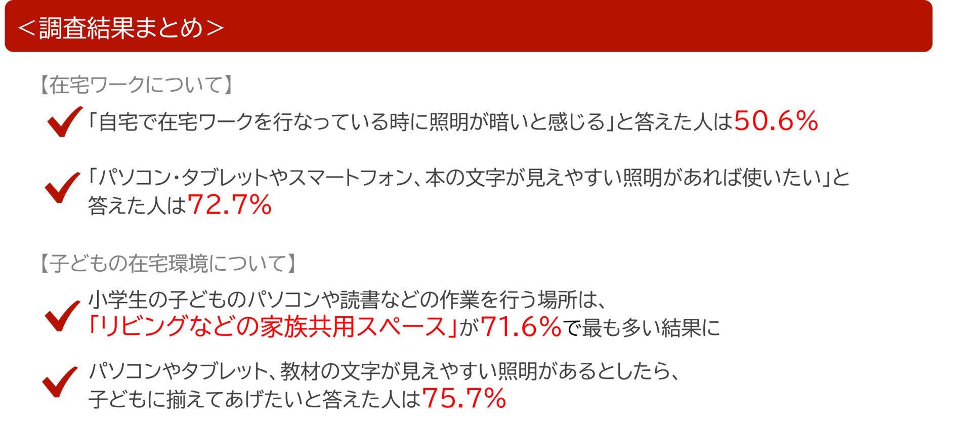 今回の調査では、在宅ワーク時に明るさが気になる方や、子どもの作業環境を整えてあげたいと思う保護者の方が多いことがわかりました。オフィス・学校と一般家庭で大きく違うのが「照明」の明るさです。特に、夕方を過ぎると日光も入らなくなるため、文字が見にくくなったり、目に負担がかかり、見えづらさから姿勢が悪くなることも。