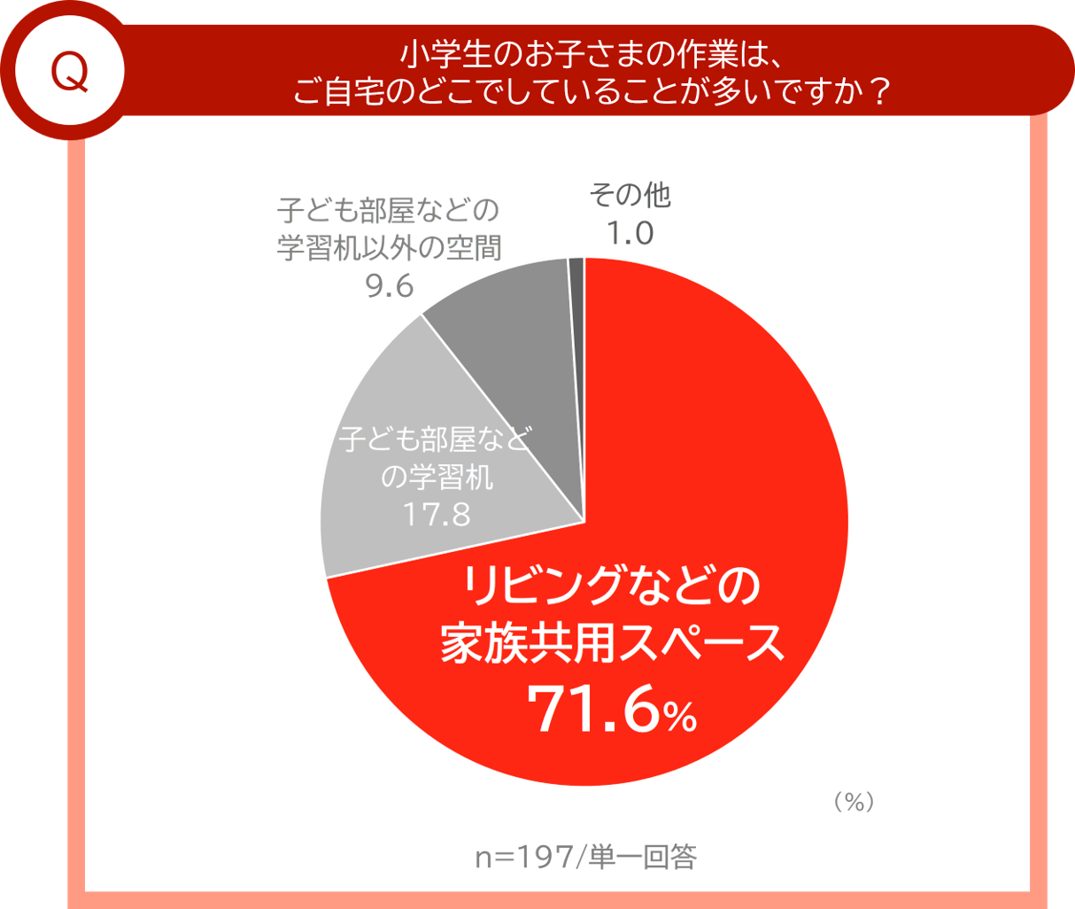 小学生の子どもが自宅で作業を行なう場所については「リビングなどの家族共用スペース」が71.6%と最も多いことがわかりました。