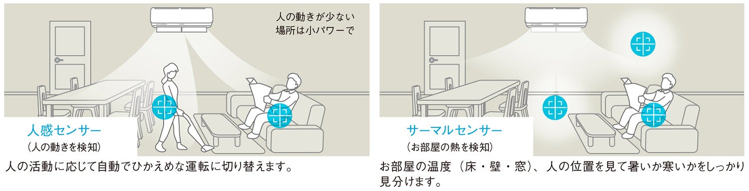 「AI自動快適運転」は、人感センサーが人の動きを、サーマルセンサーが人の位置や壁・床温度の変化を検知することで、AIが自動で快適な運転をします。さらに、風向きを自動調整する「おまかせセンサー気流」や「風あて・風よけ運転」により、室内の状況に合わせた快適性を実現します。