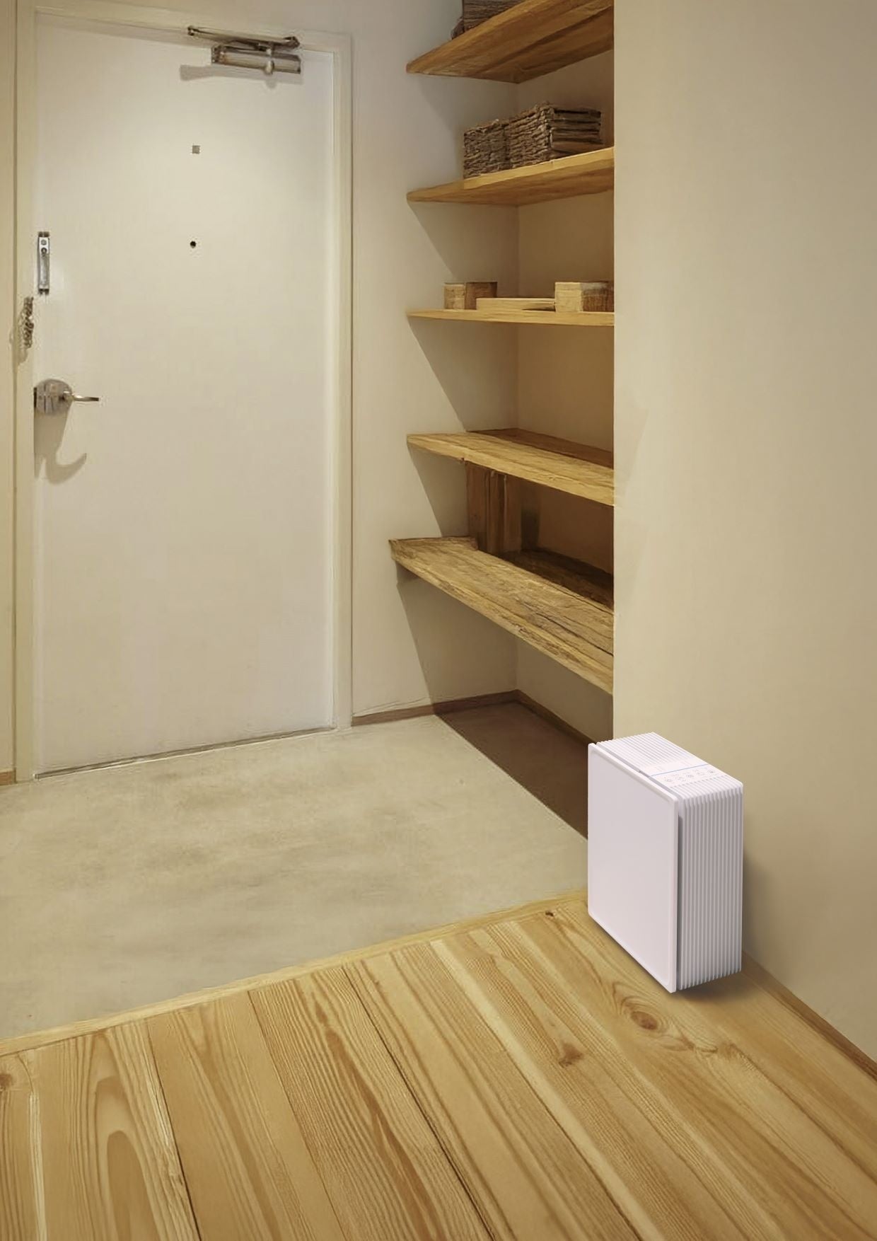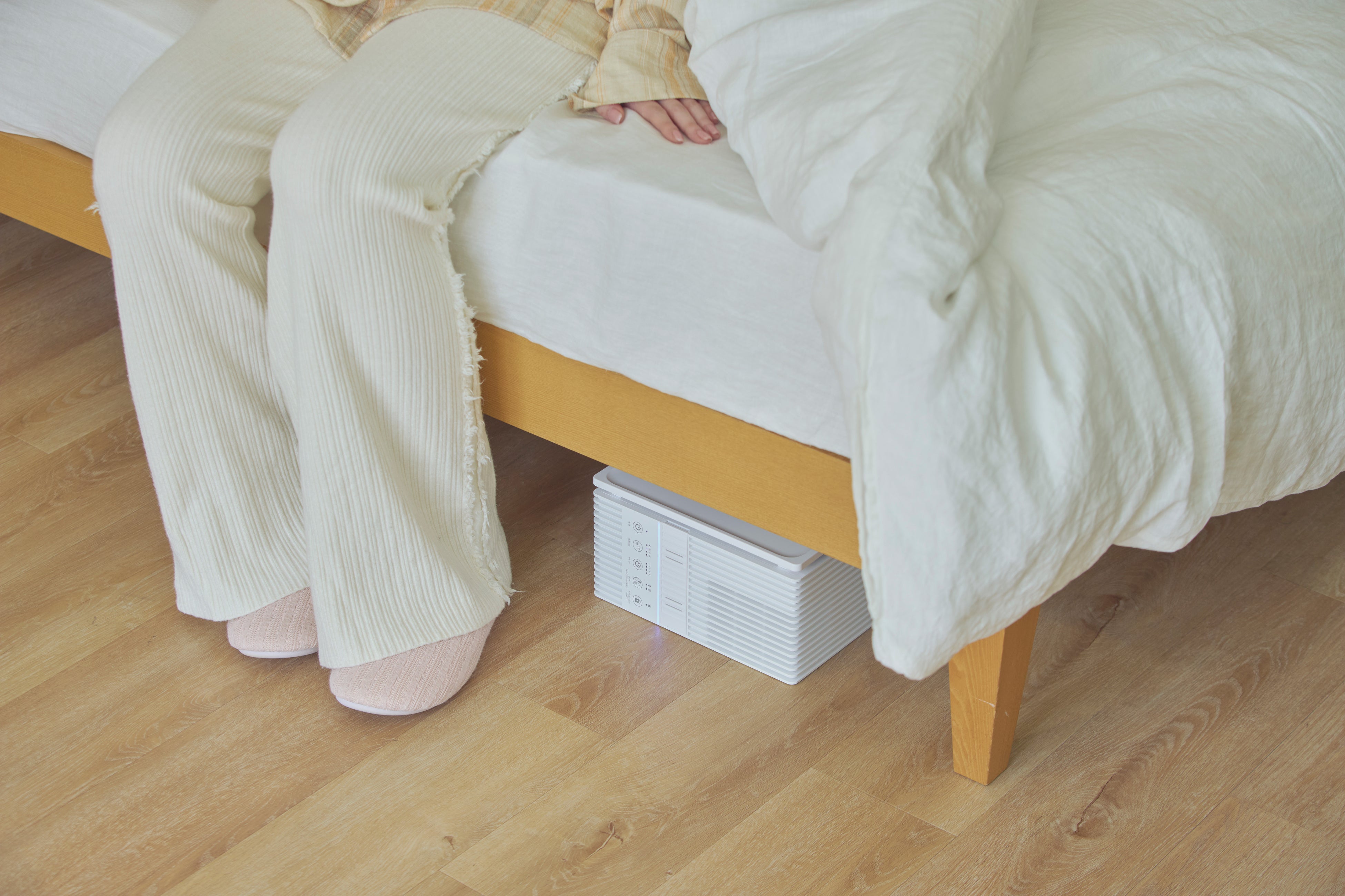 タテ置き・ヨコ置き・平置きの3WAYで置くことが可能です。設置する環境に合わせて自由な使い方ができます。ご家庭の隙間や、ベッド下、ソファ下などのデッドスペースを有効活用できるほか、棚や玄関など目立たない場所にも設置できます。特に玄関では、花粉やニオイ対策としても効果的です。