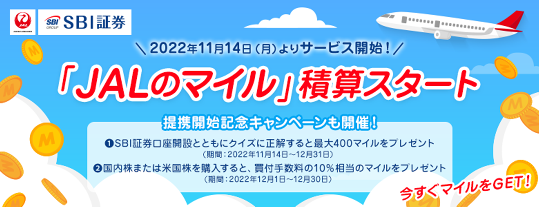 JALは、国内最大手ネット証券の株式会社SBI証券(代表取締役社長:髙村正人、以下「SBI証券」)と提携し、JALマイレージバンク (以下、「JMB」)会員向けにSBI証券での取引額に応じてJALのマイルが積算するサービスを2022年11月14日(月)より開始します。