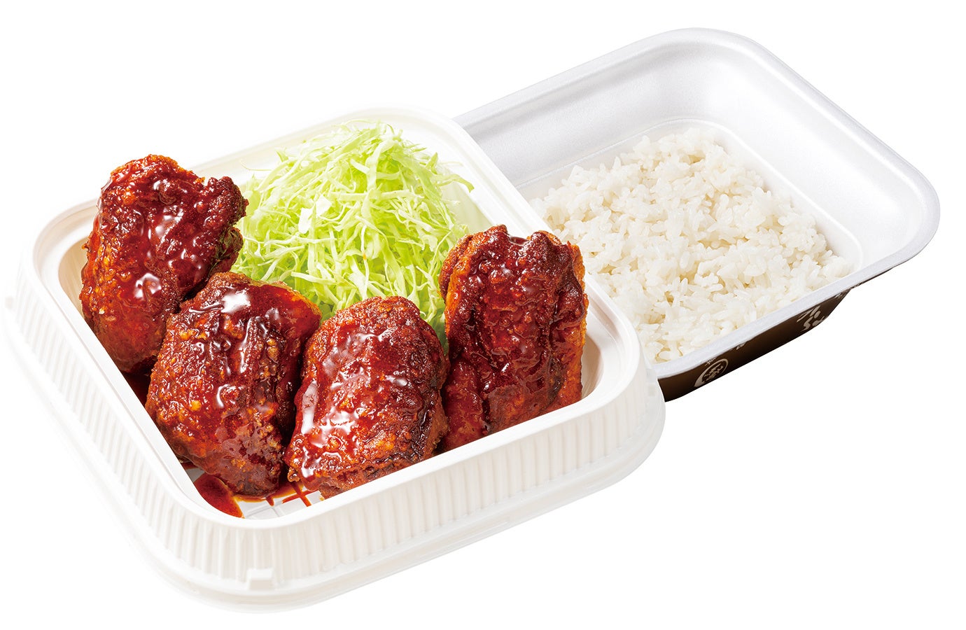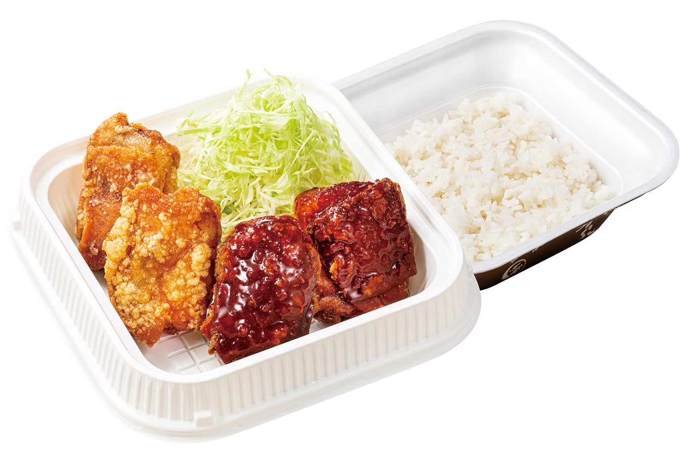 辣子鶏からあげ2個、カリッともも2個、千切りキャベツ、ご飯