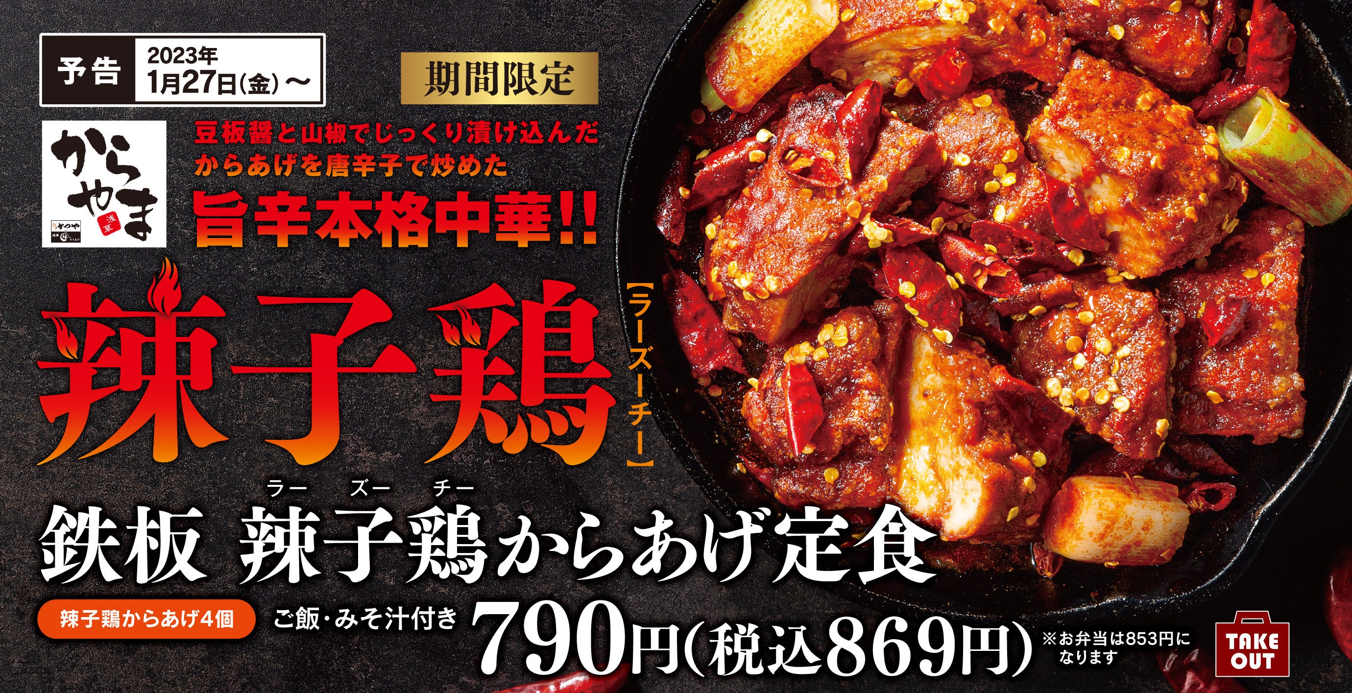とんかつ専⾨店「かつや」などを展開するアークランドサービスホールディングス株式会社の⼦会社、エバーアクション株式会社(本社:東京都千代⽥区/代表:渡部 貴)は、2023年1月27日(金)より国内の「からやま」にて「鉄板 辣子鶏からあげ定食」、「からやま」「からあげ縁」にて「辣子鶏からあげ」の販売を開始いたします。