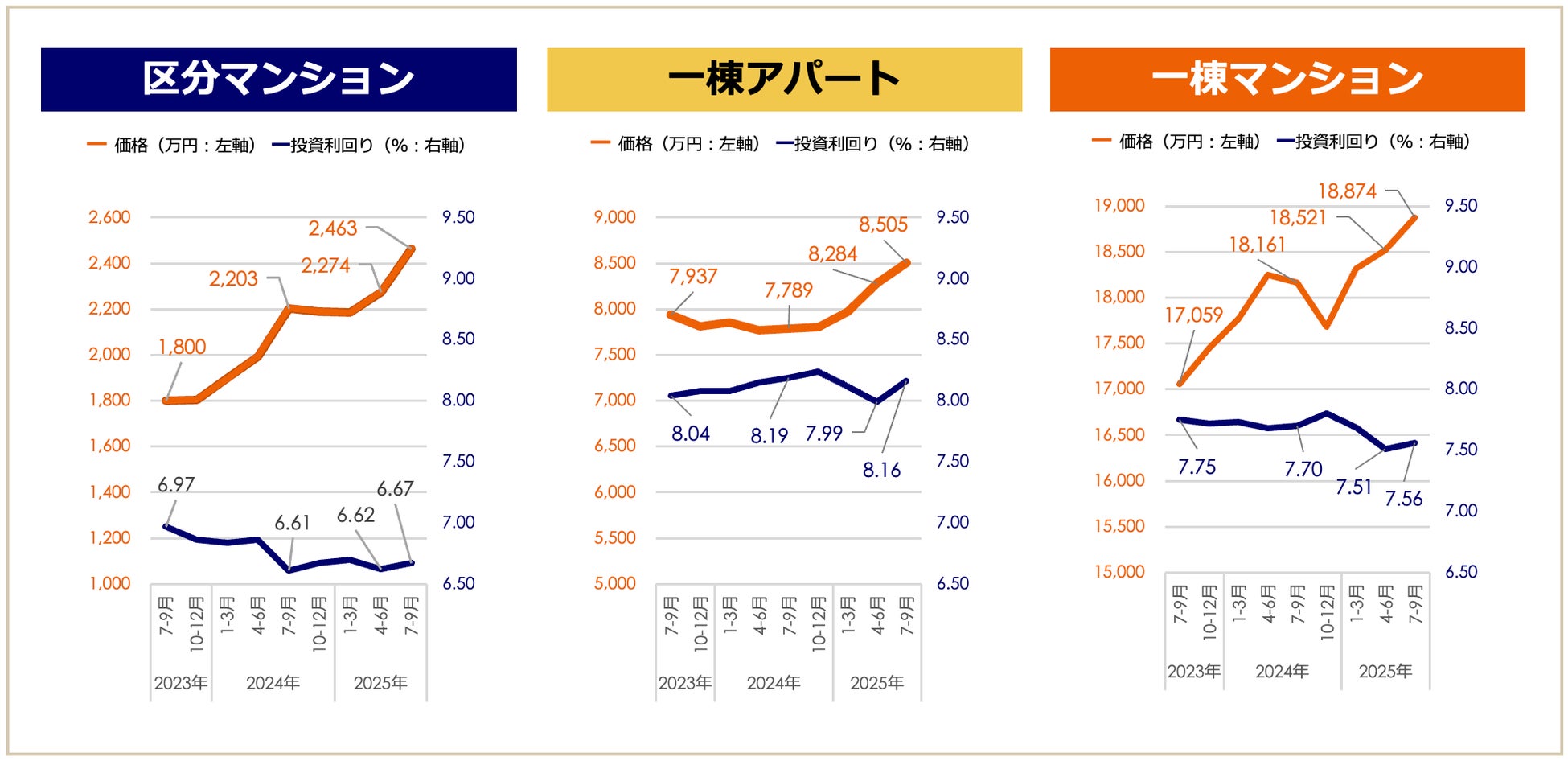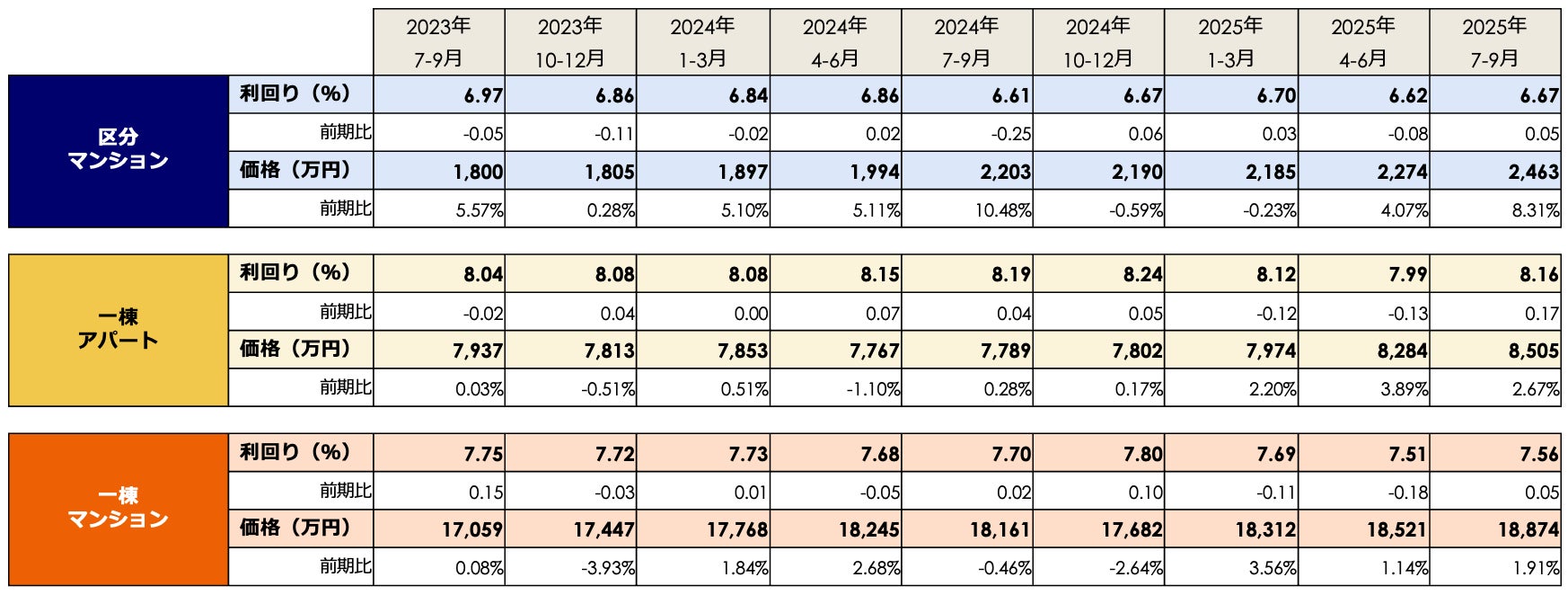 収益物件、全種別で価格・利回り共に上昇。区分マンション価格は前期比+8.3%の2,463万円に。「収益物件 市場動向四半期レポート」2025年7月~9月期
