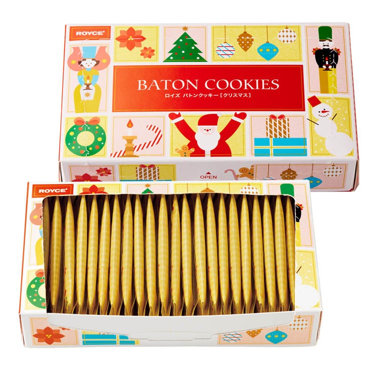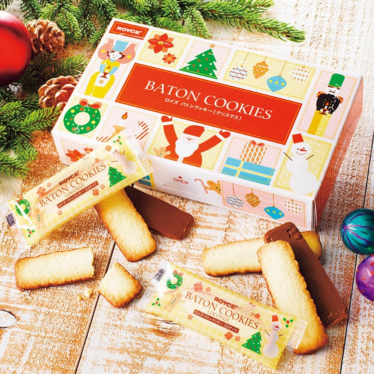 ココナッツをブレンドしたさくさく食感のクッキーの片面に、まろやかなチョコレートをコーティングしたバトンクッキー。明るい色合いのクリスマスモチーフがかわいらしい限定デザインのパッケージでお届けします。