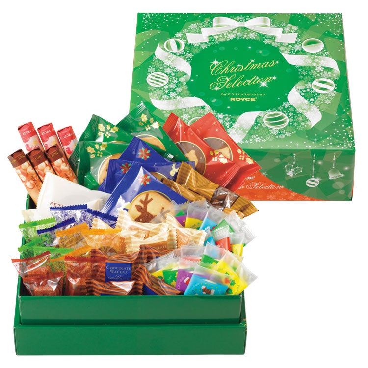 限定のクリスマスクッキーズをはじめ、ロイズの人気商品をバラエティ豊かに詰め合わせ、雪の結晶を用いてガラスのリースのように描いた包装紙で包みました。ギフトにも喜ばれるおいしさが詰まっています。