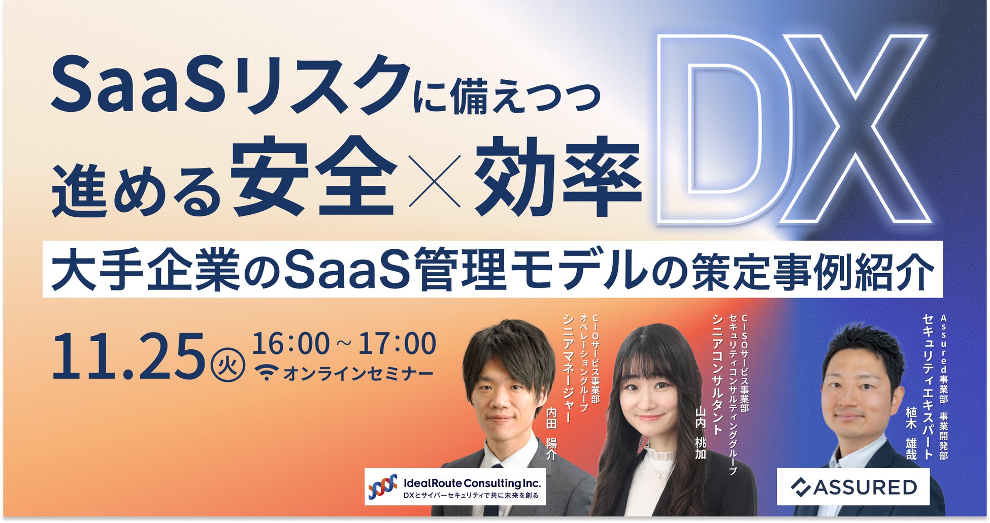 株式会社アシュアード(本社:東京都渋谷区、代表取締役社長:大森 厚志)は、アイディルートコンサルティング株式会社と共催で、「SaaSリスクに備えつつ進める安全×効率DX ~大手企業のSaaS管理モデルの策定事例紹介~」を、2025年11月25日(火)にオンラインにて開催することをお知らせいたします。