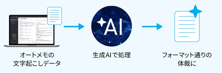 「オートメモ」で文字起こしした会議の内容を生成AIに読み込ませることで、社内で事前に作成された議事録フォーマットに自動で整形されます。