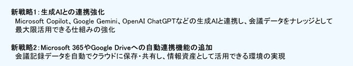 近年、企業では会議データが大量に蓄積されていますが、データが散在して活用されない、必要な情報がすぐ見つからない、生成AIを活用しきれていないなどの課題に直面しています。こうした課題を解決し、“AIナレッジプラットフォーム”を実現するために、以下の2つの新戦略を推進し、今月下旬から新機能を順次提供いたします。