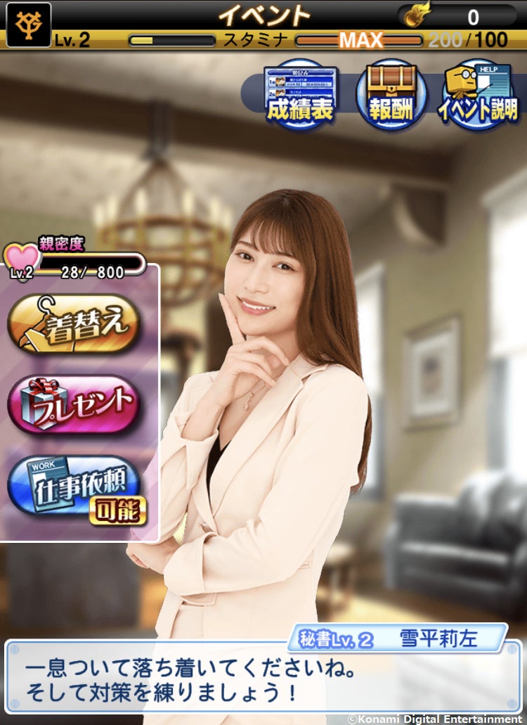 仕事を依頼できる秘書は、3人から1人を選びます。1日に1度だけ、秘書に「仕事依頼」ができます。試合をこなしたり、アイテムで秘書レベルを上げることで、依頼できる仕事の内容が増えたりします。